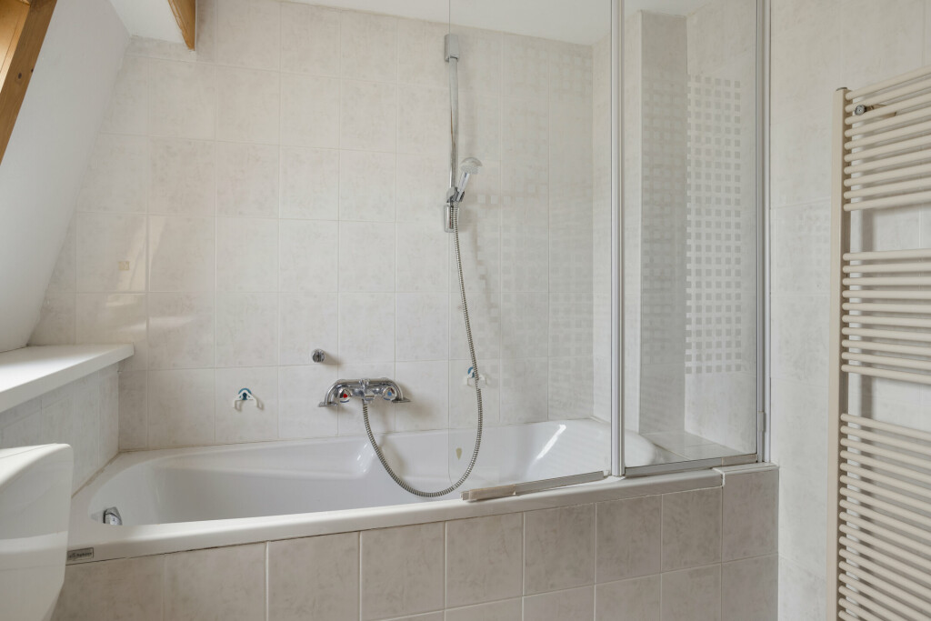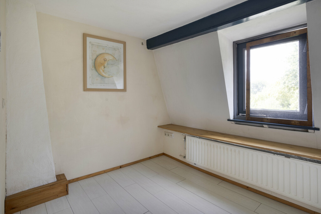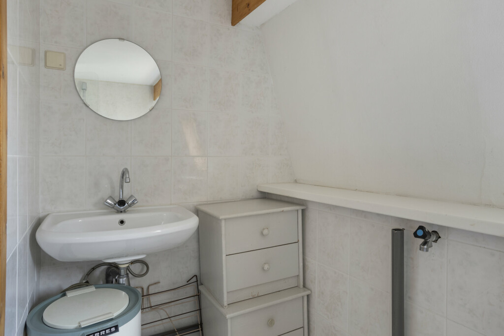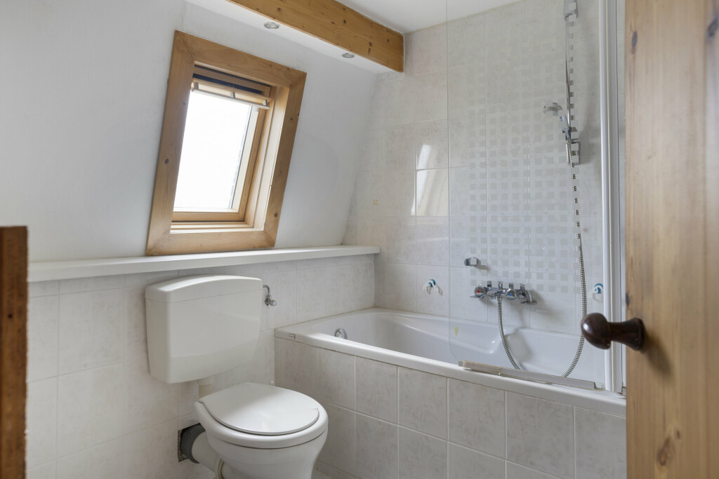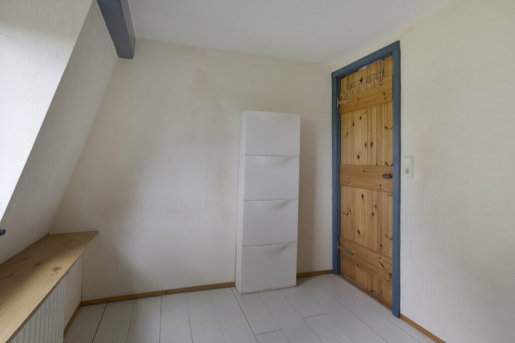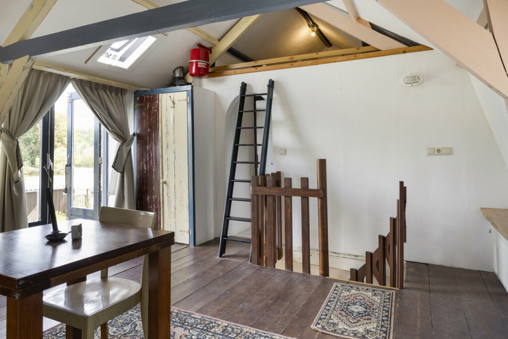 Op de eerste verdieping bevindt zich een grote, open ruimte met vaste kast (met cv-opstelling) en een dubbele deur, met berde houten trap, naar de Bovenweg met gazonnetje. Vanaf hier heb je toegang tot de slaapkamer en de badkamer, die is voorzien van een douche bad combinatie, toilet, wastafel en aansluiting voor de wasmachine. Een losse trap leidt naar de vliering, die als extra opslagruimte kan dienen.