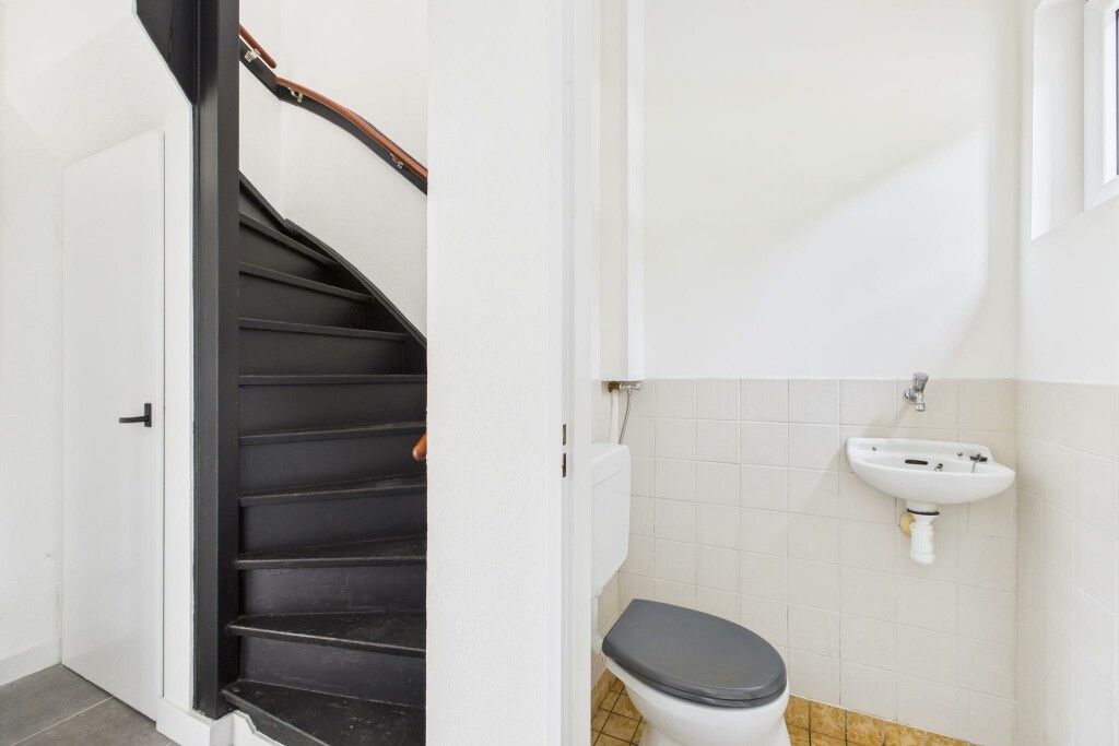 Bij binnenkomst tref je de hal met meterkast, trapopgang, bergkast en het toilet. Vanuit de hal bereik je de lichte doorzonwoonkamer met laminaatvloer en een schouw voor de eventuele gaskachel. Dankzij het compacte formaat van de woning is een gaskachel altijd voldoende gebleken om de gehele woning te verwarmen, maar je kan er natuurlijk ook voor kiezen om een cv-installatie aan te laten leggen.