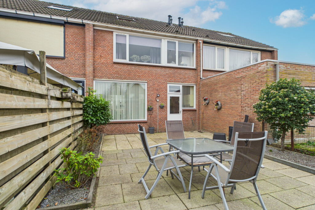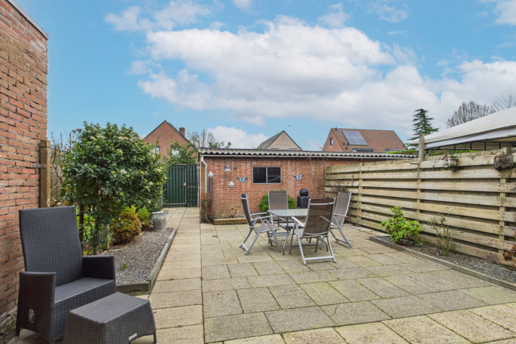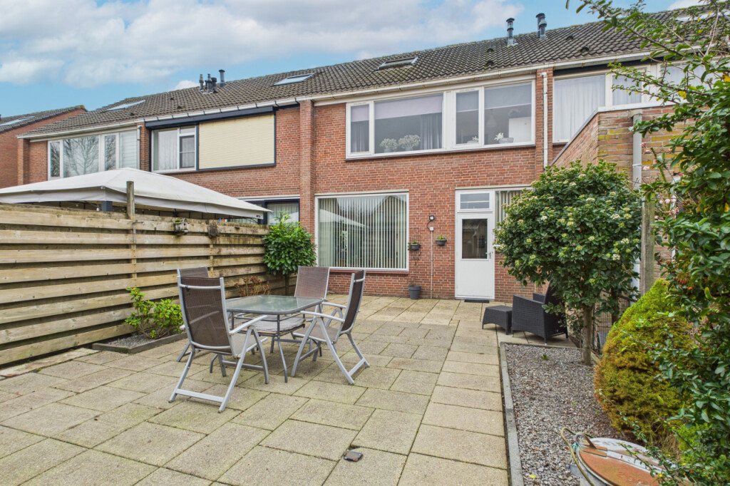 De achtertuin is gelegen op het noordoosten en is verzorgd aangelegd met een fijn terras en meerdere plantenborders. Het is een heerlijke plek om buiten te zitten en te genieten van rust. Dankzij de eigen achterom is de tuin ook praktisch in gebruik. Achterin de tuin staat een stenen berging die ideaal is voor extra opslag of tuingereedschap.