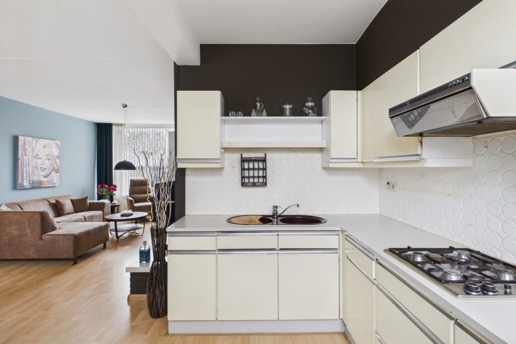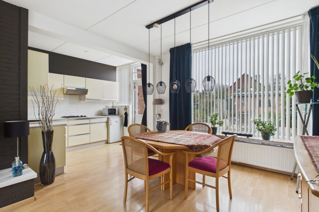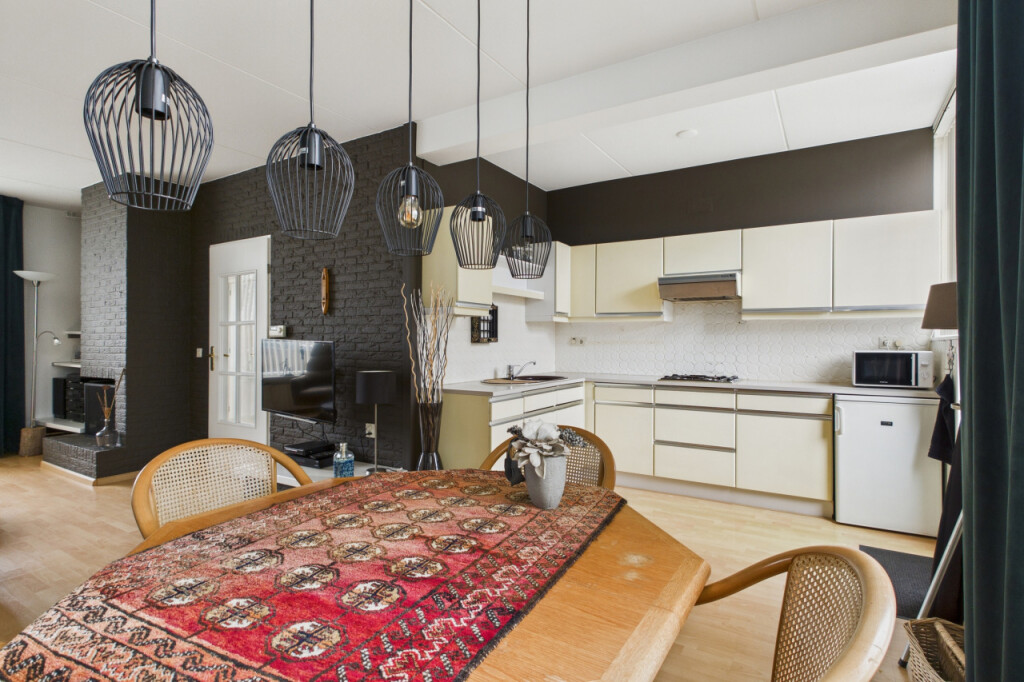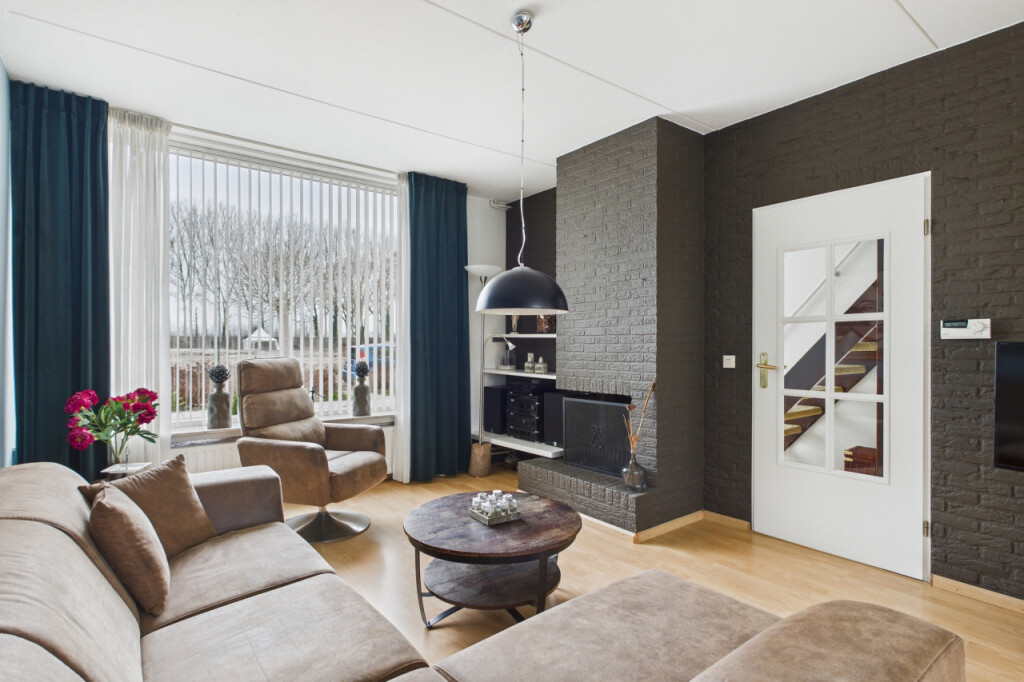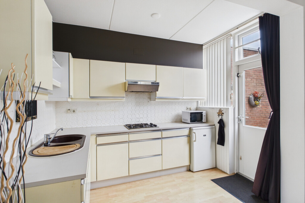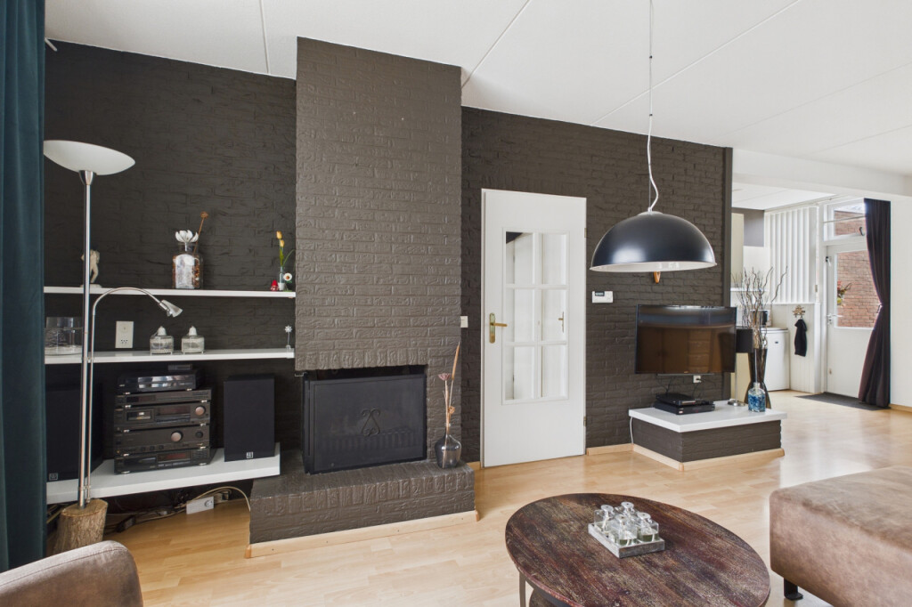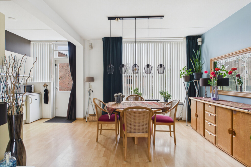 Je komt binnen in de hal met meterkast, toilet met fonteintje en de open trapopgang naar de eerste verdieping. Vanuit de hal loop je door naar de lichte doorzonkamer, waar de grote ramen zorgen voor een prettige lichtinval en de sfeervolle haard bijdraagt aan een warm en huiselijk gevoel. Aansluitend bevindt zich de ruime open keuken, geplaatst in een praktische hoekopstelling en voorzien van een gaskookplaat, afzuigkap en dubbele spoelbak. Vanuit de keuken geeft de achterdeur direct toegang tot de tuin.