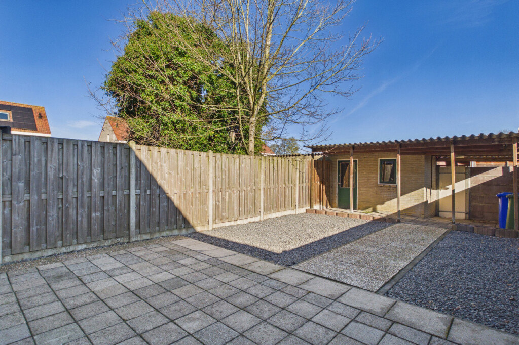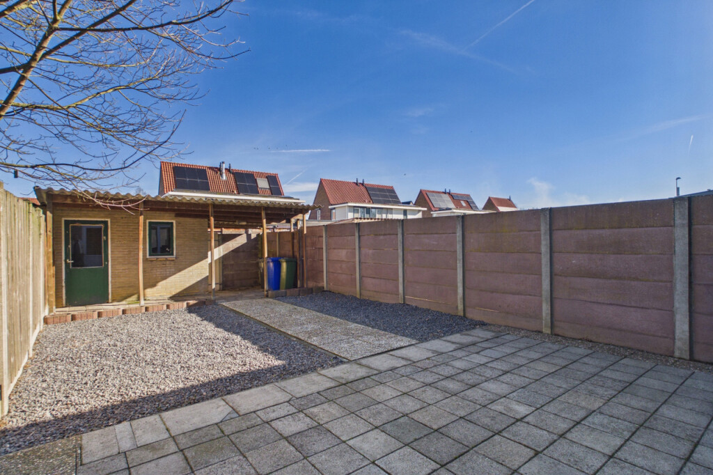 De achtertuin is gelegen op het noordoosten en is onderhoudsvriendelijk aangelegd met een terras en grind. Dankzij de eigen achterom is de tuin gemakkelijk bereikbaar. Achterin de tuin staat een stenen berging, ideaal voor het stallen van fietsen en het opbergen van tuinspullen. Daarnaast is er een overkapping aanwezig, waardoor je ook op minder zonnige dagen fijn buiten kunt zitten.