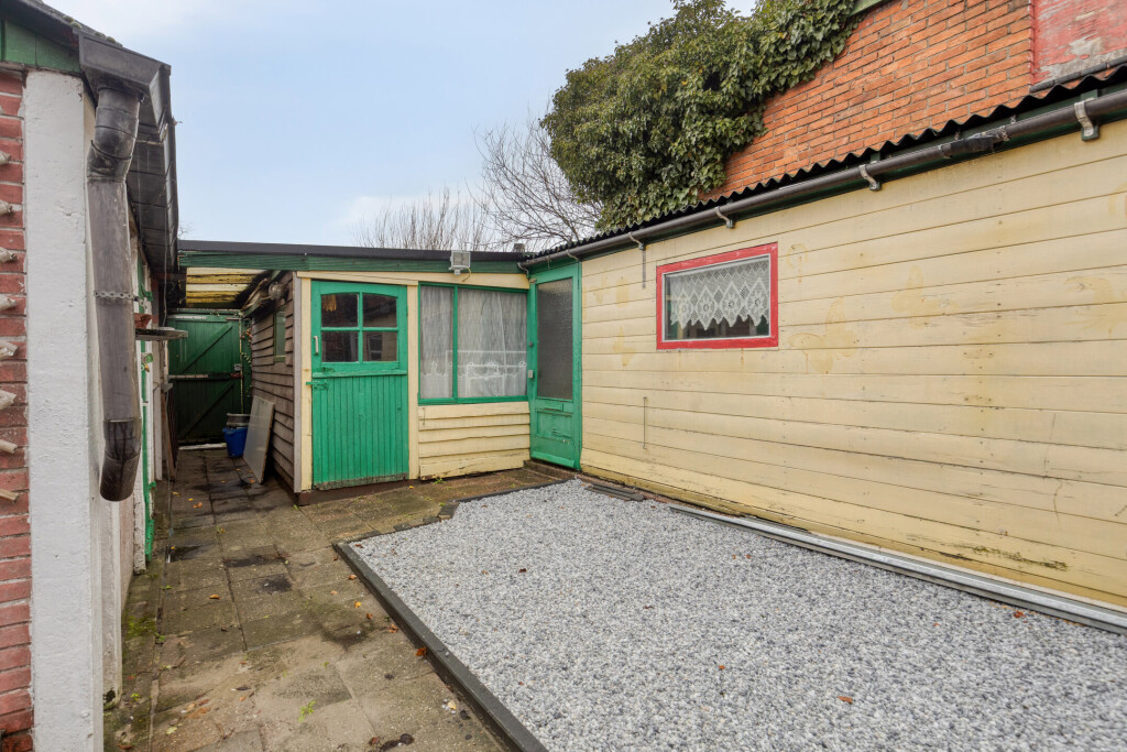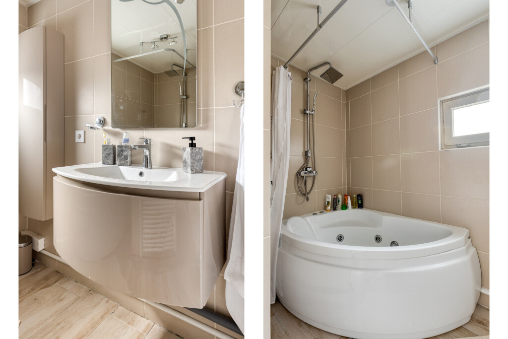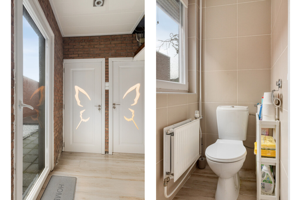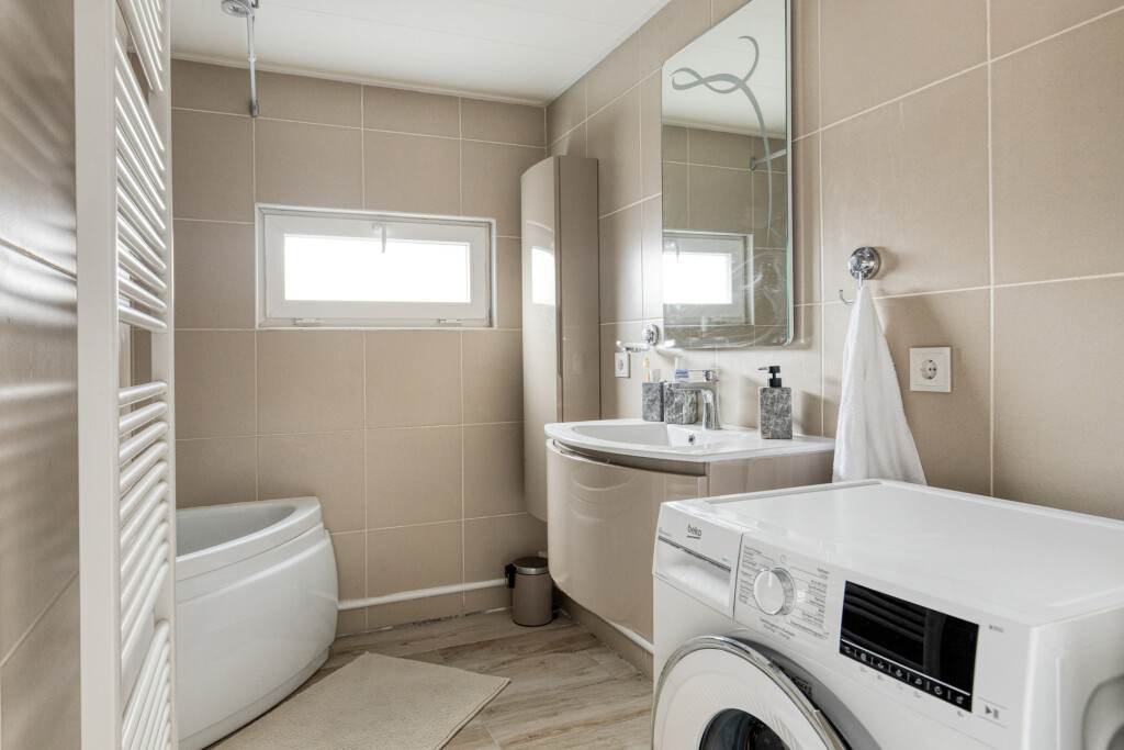 Grenzend aan de keuken is de bijkeuken van waaruit ook de tuin te bereiken is. Hier hangt de cv-combiketel en is een vaste bergkast. Tevens zijn hier het vernieuwde toilet en vernieuwde badkamer. Beide zijn betegeld is een eigentijdse stijl. De badkamer is daarbij uitgerust met een wastafel met meubel en jacuzzi met douchefunctie. Ook is in de badkamer de aansluiting voor de wasmachine.