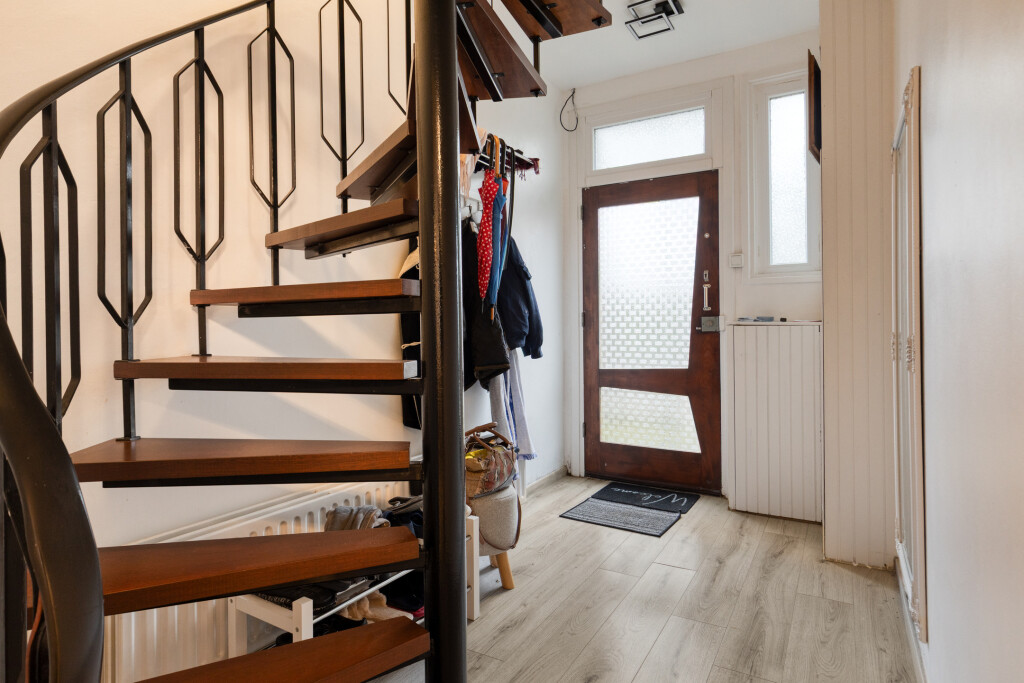 Entree via de hal met meterkast en wenteltrap naar eerste verdieping. De vloer is voorzien van laminaat die mooi doorloopt naar de woonkamer. In de woonkamer is een knus zitgedeelte aan de voorzijde en ruim eetgedeelte aan de achterzijde. De dubbele tuindeuren geven toegang naar de tuin.