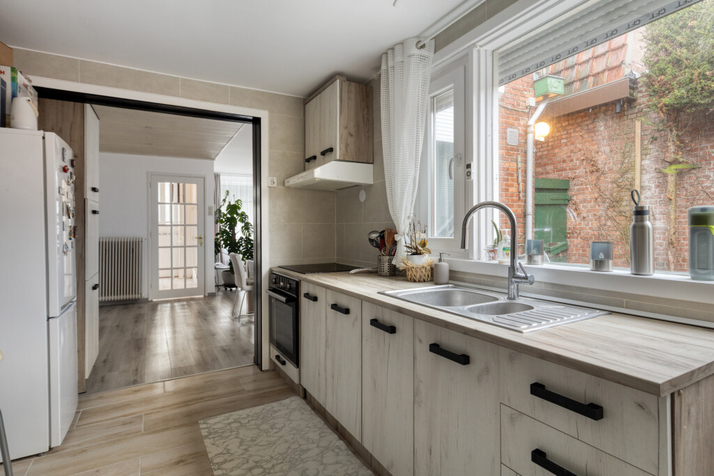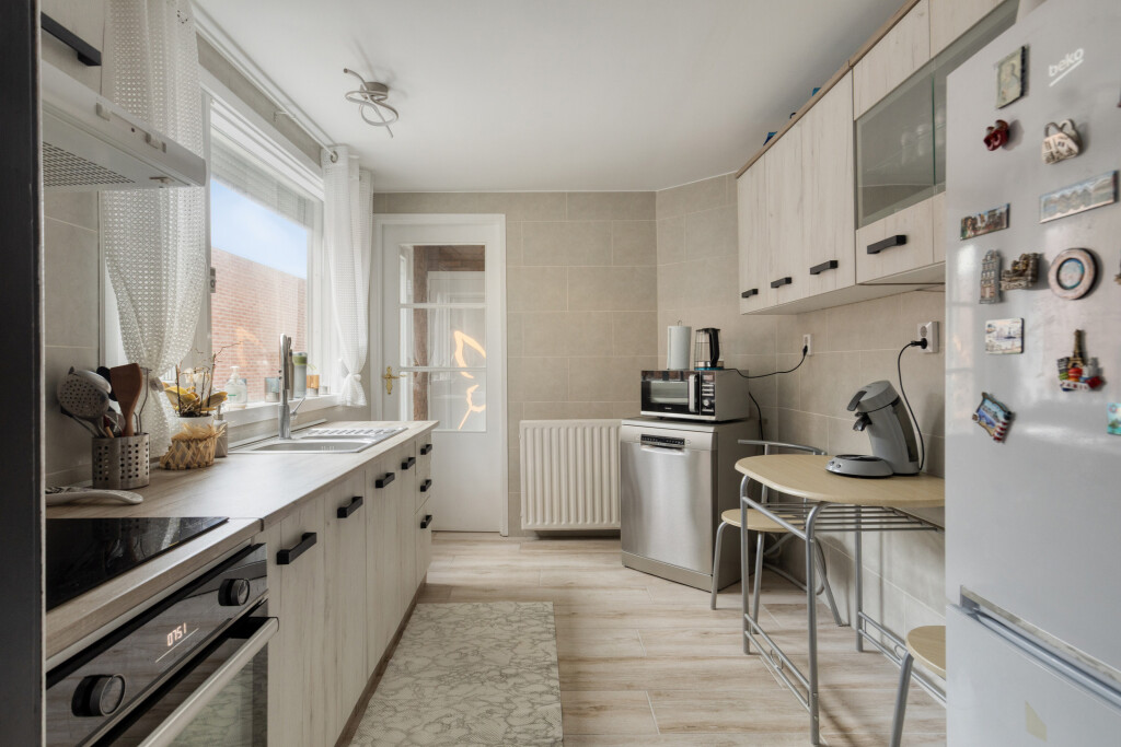 Vervolgens kom je in de half open keuken. Deze is opgesteld in een rechte wandopstelling met kookplaat, afzuigkap en oven. De keuken is breed genoeg om er nog een tafel te plaatsen én een vrijstaande koelkast en vaatwasser neer te zetten.