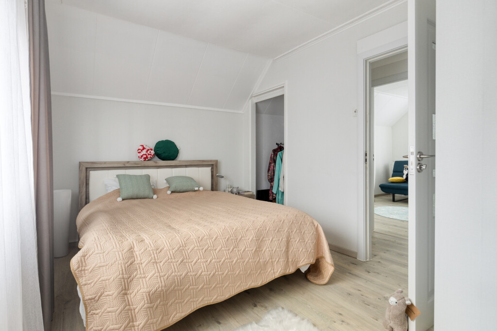 Op de eerste verdieping bevinden zich de overloop en drie slaapkamers. De grote slaapkamer is aan de voorzijde gelegen en heeft een ingebouwde kast. Ook op de overloop is nog een ingebouwde kast. De twee kleinere slaapkamers zijn aan de achterzijde gelegen en vrijwel identiek qua afmeting. Alle slaapkamers hebben rolluiken voor een goede privacy en nachtrust.