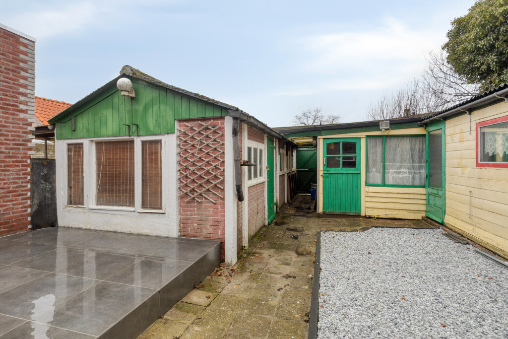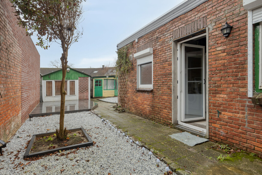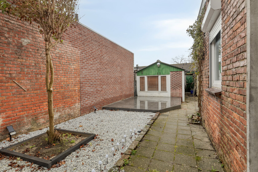 De ruime tuin is via een achterom te bereiken, verzorgd aangelegd en makkelijk in onderhoud. Achterin de tuin is nog een garage die via de achterliggende weg te bereiken is en drie bergruimtes.