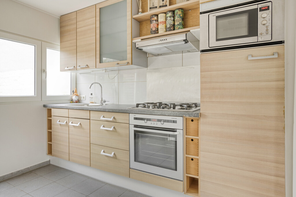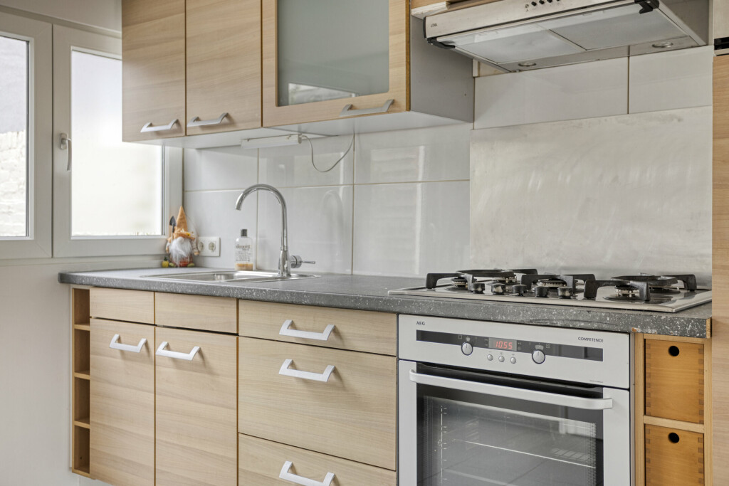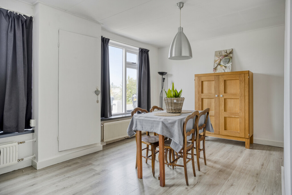Bij binnenkomst stap je in de hal, waar de gasmeter is gesitueerd. Vanuit hier is er toegang tot het toilet, de badkamer met wastafel en douche, en de keuken. De keuken ligt aan de achterzijde van de woning en is voorzien van inbouwapparatuur. Vanuit de keuken leidt een klein afstapje naar de lichte woonkamer aan de voorzijde, die zich over de gehele breedte van de woning uitstrekt. In de woonkamer bevindt zich de meterkast en is bergruimte onder de trap aanwezig, ideaal voor het opbergen van spullen. De woonkamer is aangenaam ruim en biedt volop gelegenheid om te ontspannen of gasten te ontvangen.