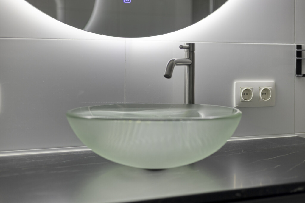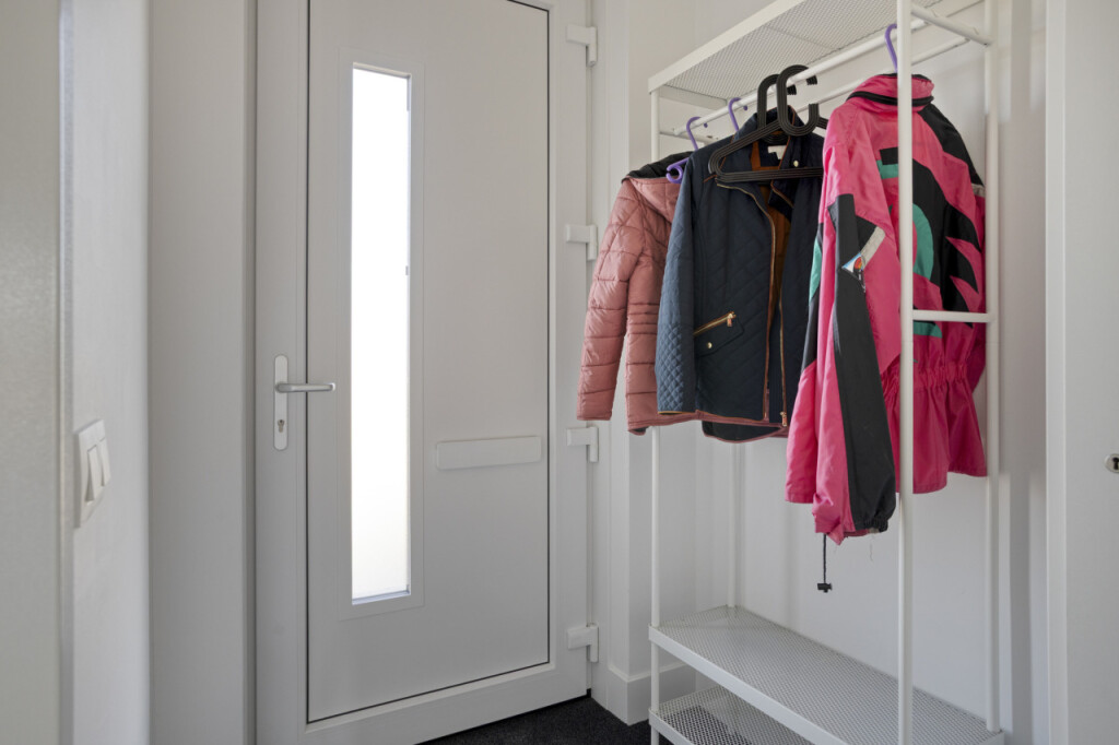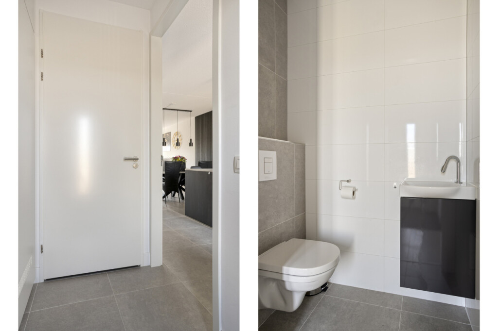 Entree in de hal met meterkast en hangtoilet met fonteintje. De mooie tegelvloer is vanuit de hal doorgelegd in de keuken en woonkamer en wordt verwarmd middels een comfortabele vloerverwarming.