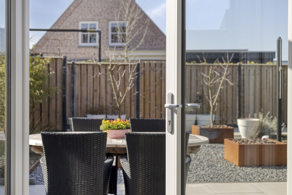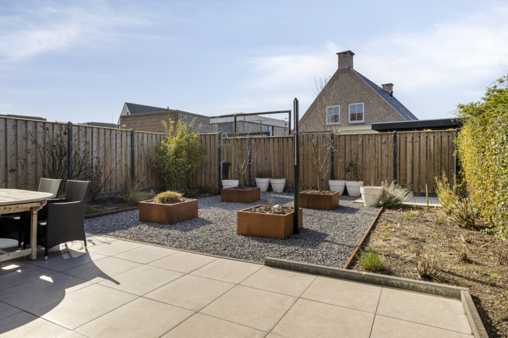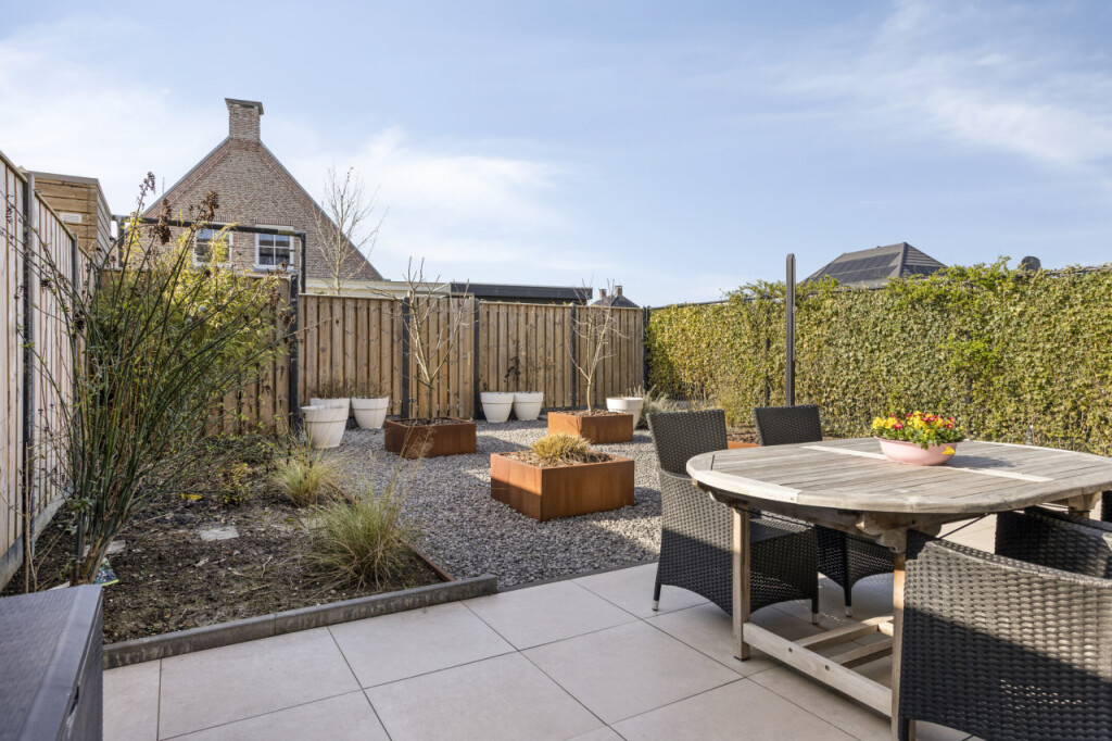 De onderhoudsvriendelijke tuin, gelegen op westen, is aangelegd met een ruim terras en volledig afgesloten met begroeide omheining en een fraai houten schutting met poort naar de achtergelegen brandgang. De tuin heeft veel privacy en biedt een ruimtelijk en natuurlijk gevoel zonder dat je er veel werk aan hoeft te besteden. Een heerlijke plek om in alle privacy en rust van het buitenleven te genieten.