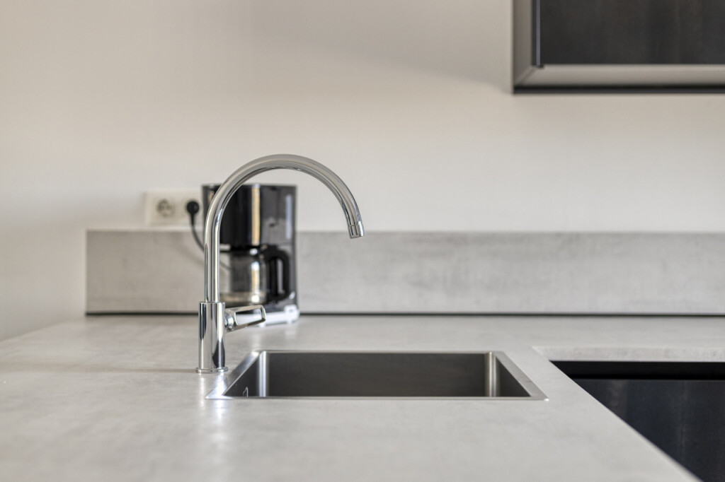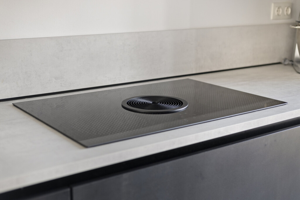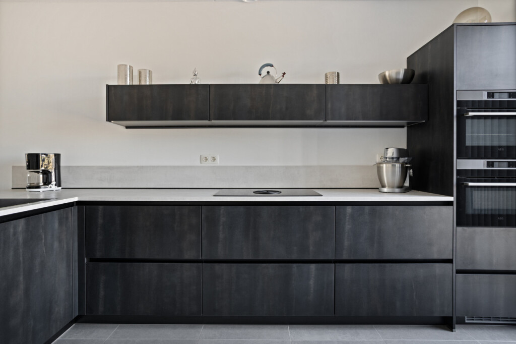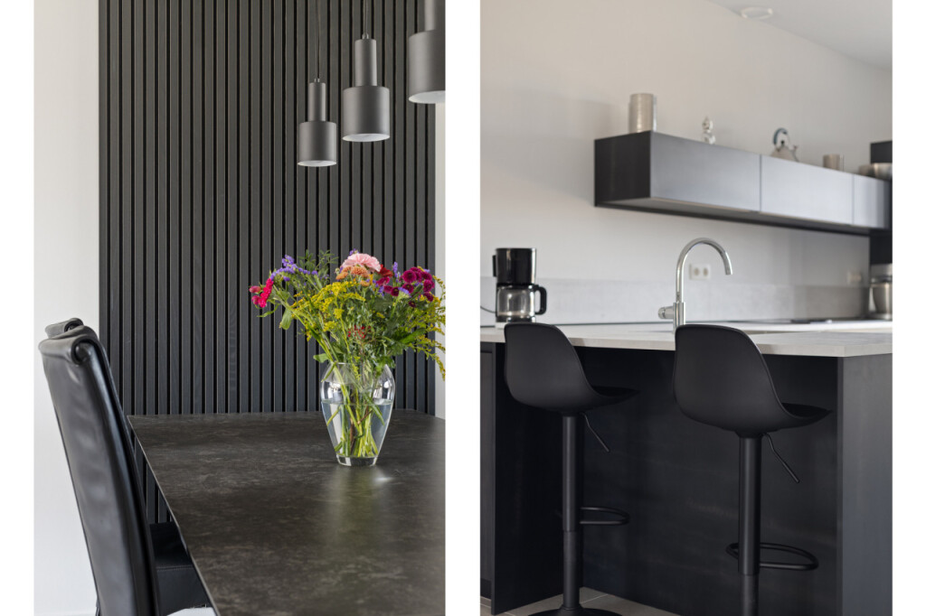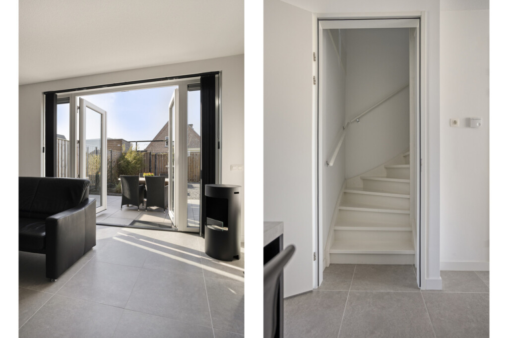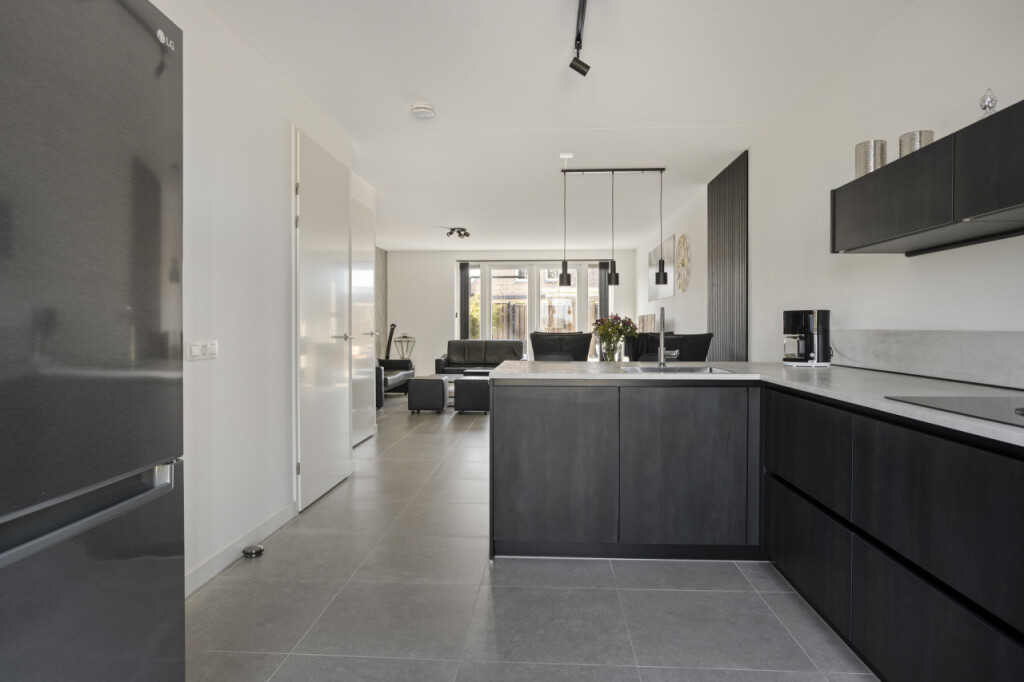 Vanuit de hal stap je direct de ruime open keuken binnen. De moderne luxe keuken met schiereiland is compleet uitgerust met alles wat je als kookliefhebber nodig hebt. Zo is de keuken uitgerust met een BORA inductiekookplaat met ingebouwde afzuiging, combimagnetron, combi stoomoven en vaatwasmachine. Het schiereiland met zitbar is zowel praktisch als gezellig en biedt extra werk- en opbergruimte, terwijl de bar een fijne plek is om te ontbijten, lunchen of gezellig een drankje te doen terwijl er gekookt wordt. Vanuit de keuken heb je direct contact met de woonkamer aan de achterzijde van de woning, waar je door de grote raampartij direct zicht en contact hebt de tuin. De royale woonkamer, met portaal waar de trap naar de verdieping is geplaatst en praktische trappenkast, is een heerlijke leefruimte en geeft via de dubbele tuindeuren toegang tot het terras en de tuin.