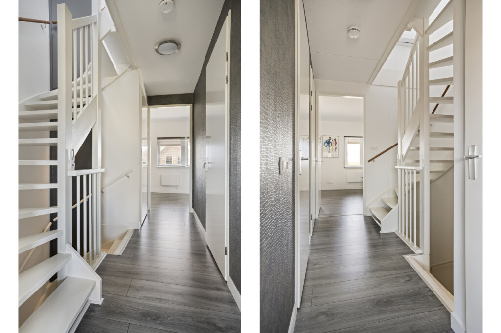 Op de tweede verdieping geeft de overloop toegang tot nog 2 ruime slaapkamers en inloopkast. De tweede verdieping is eveneens afgewerkt met dezelfde laminaatvloer.