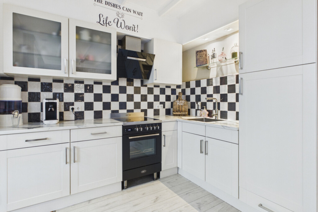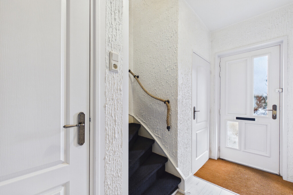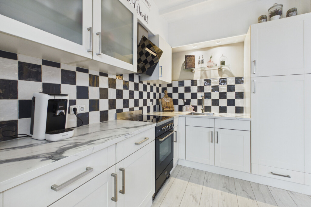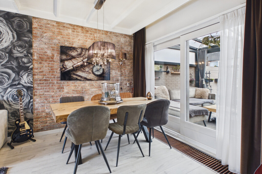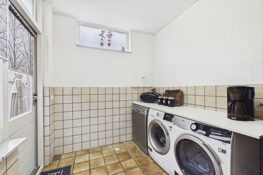 Je komt de woning binnen in de hal met meterkast, toilet, trapopgang naar de eerste verdieping en een handige trapkast voor extra bergruimte. Vanuit de hal stap je de lichte doorzonwoonkamer binnen, waar grote raampartijen zorgen voor een prettige lichtinval. Aan de achterzijde geeft een schuifpui toegang tot de serre, waardoor binnen en buiten op een mooie manier met elkaar worden verbonden. De open keuken uit 2023 is geplaatst in een hoekopstelling en voorzien van een inductiekookplaat, afzuigkap, oven van Boretti, een spoelbak en een close in boiler. Aansluitend bevindt zich de praktische bijkeuken met aansluitingen voor witgoedapparatuur en een loopdeur naar de achtertuin.
