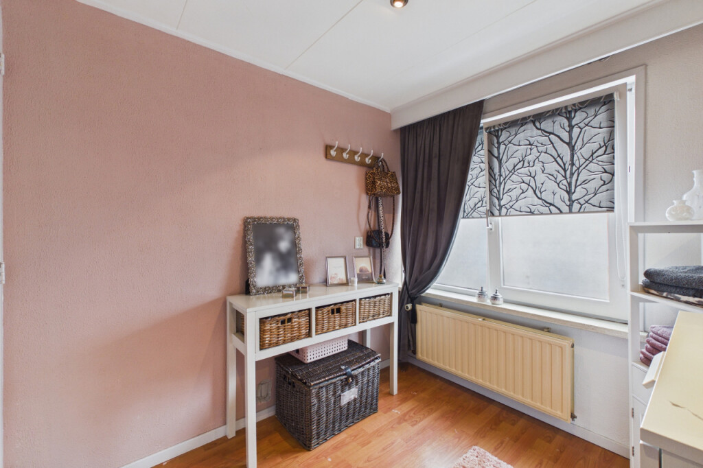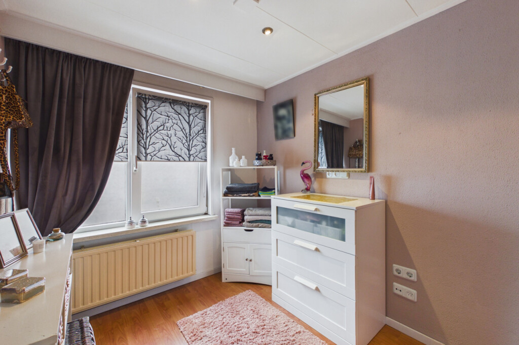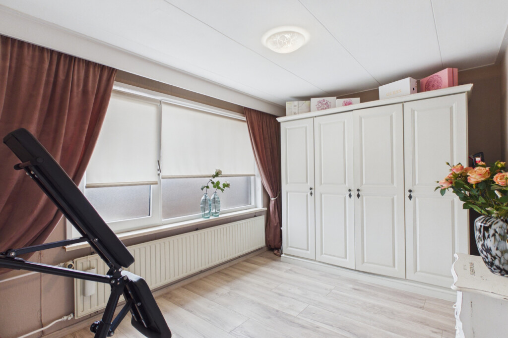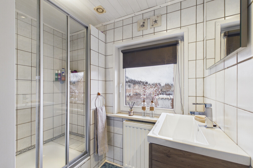 Op de eerste verdieping geeft de overloop toegang tot drie slaapkamers en de badkamer. De slaapkamers zijn stuk voor stuk netjes afgewerkt en multifunctioneel te gebruiken als kinder-, werk- of hobbykamer. De badkamer is voorzien van een douchecabine en een wastafel met meubel.