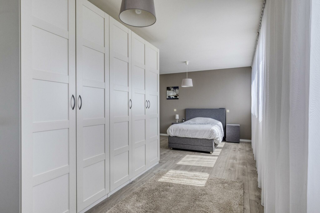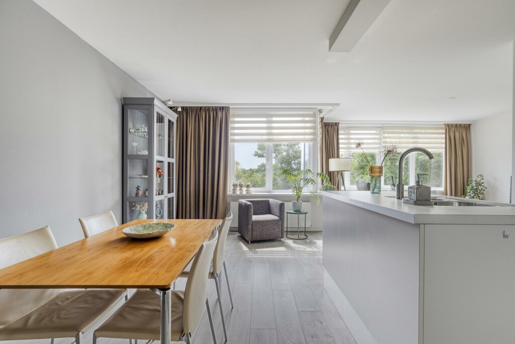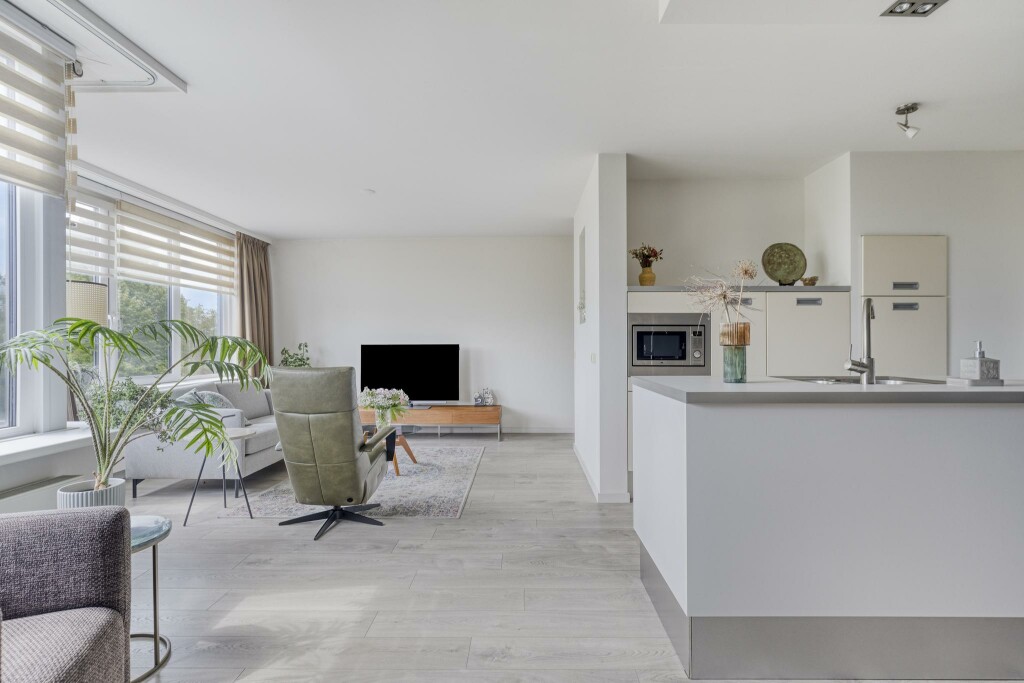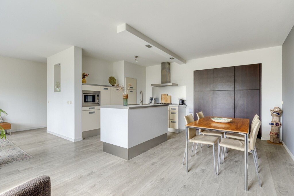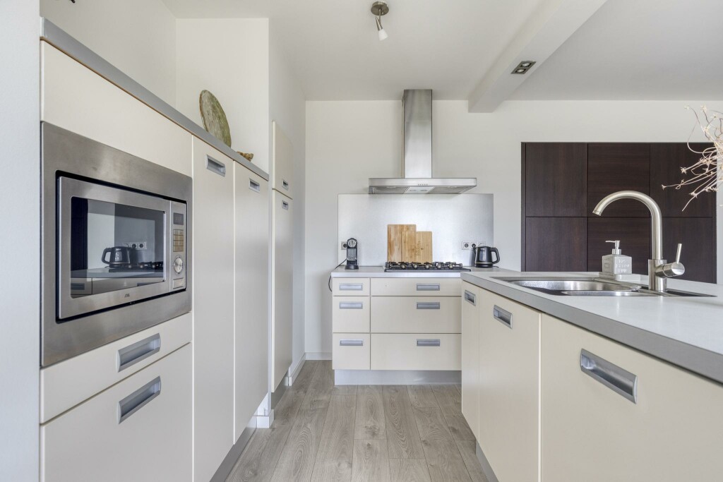 De luxe keuken is compleet uitgerust met inbouwapparatuur zoals een 5-pits gaskookplaat, vaatwasser, combimagnetron en koelkast. De strakke afwerking, inbouwspots en een inbouwkast geven het geheel een moderne uitstraling.