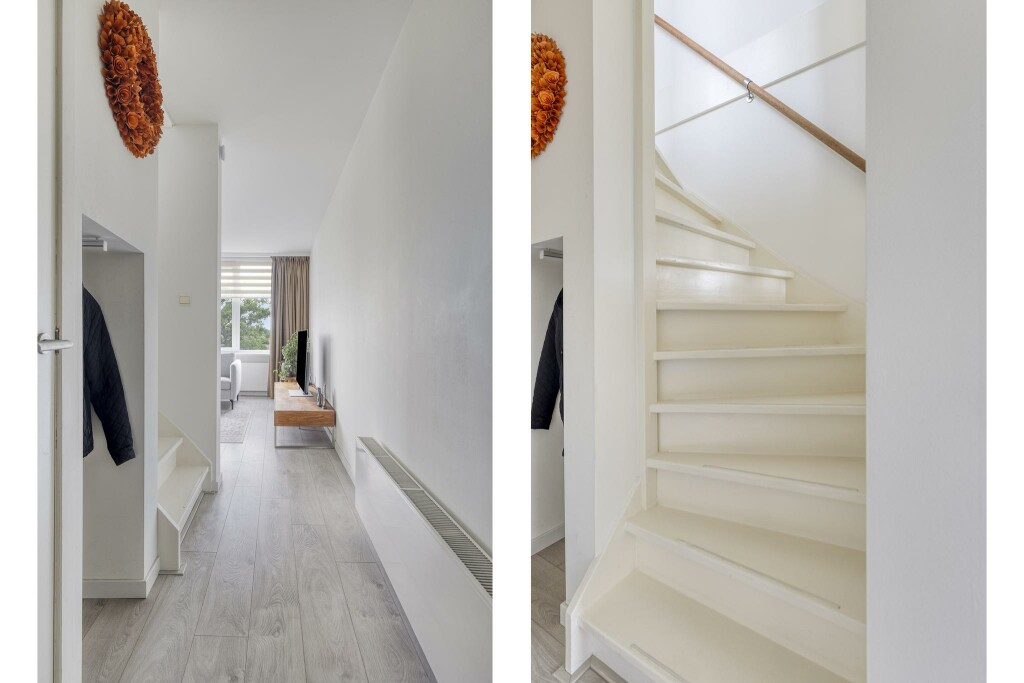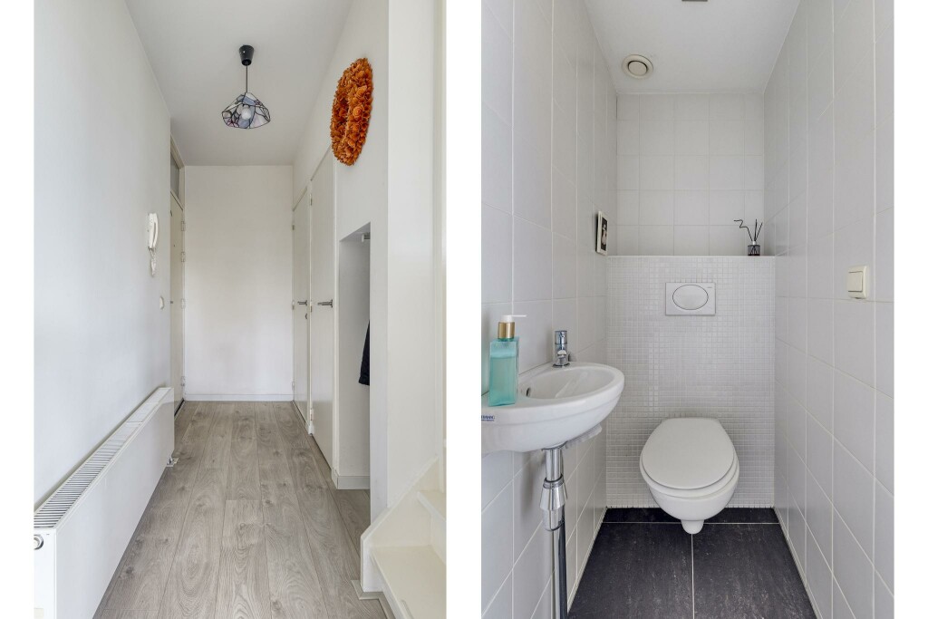 Binnenkomst via de hal met modern toilet en fonteintje, meterkast en trap naar de 4e verdieping. De ruime woonkamer met grote raampartijen en veel lichtinval sluit naadloos aan op de open keuken en eetkamer.