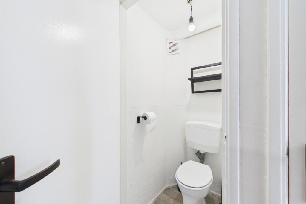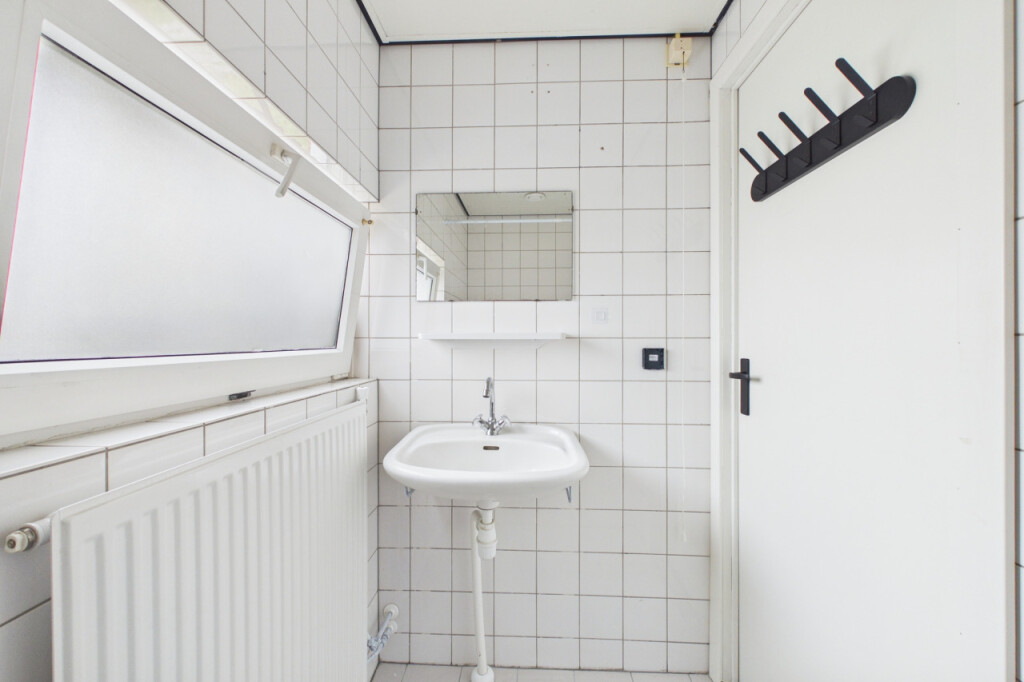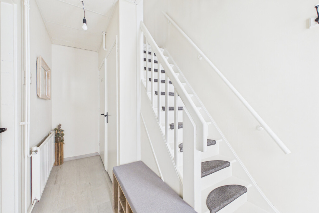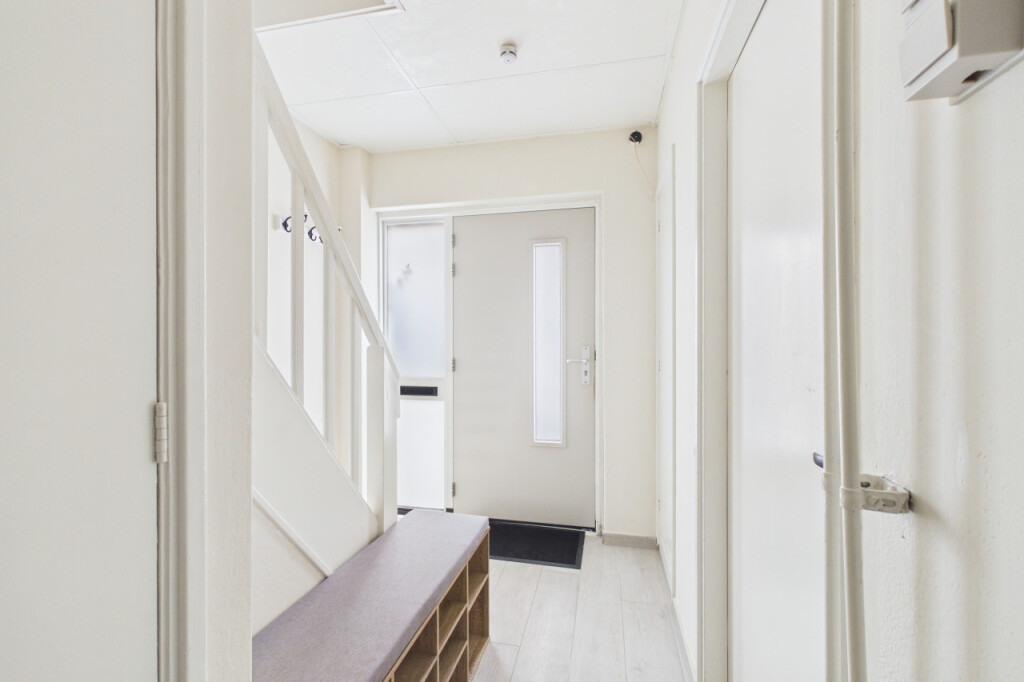 Je komt binnen in de hal met meterkast, toiletruimte, trapopgang en praktische bergkast. Vanuit hier bereik je de lichte doorzon woonkamer met een prettige indeling en een deur naar de achtertuin.