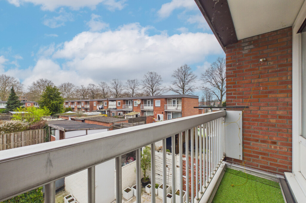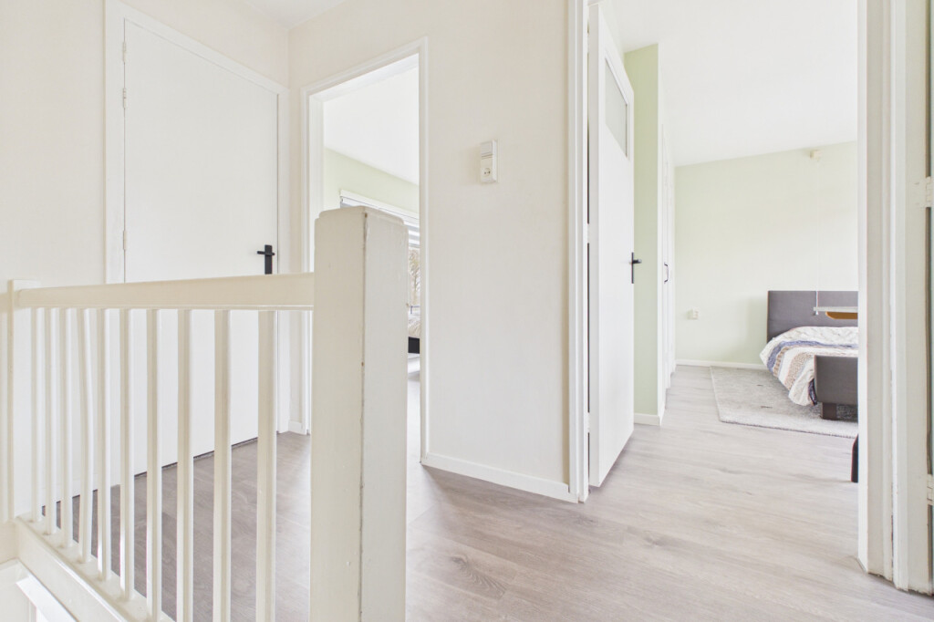 Overloop met toegang tot drie slaapkamers, alle voorzien van praktische vaste kasten. Eén slaapkamer beschikt over een balkon. De badkamer is betegeld en uitgevoerd met douche en wastafel.