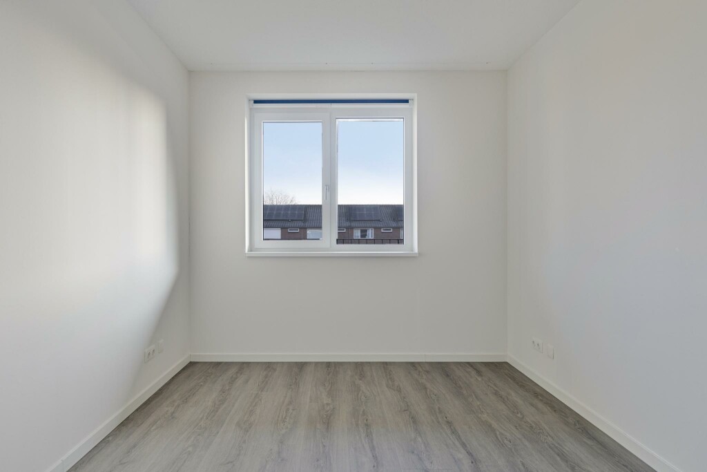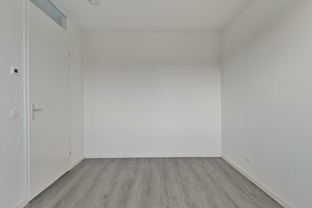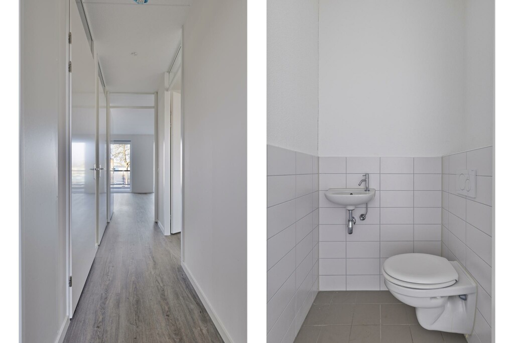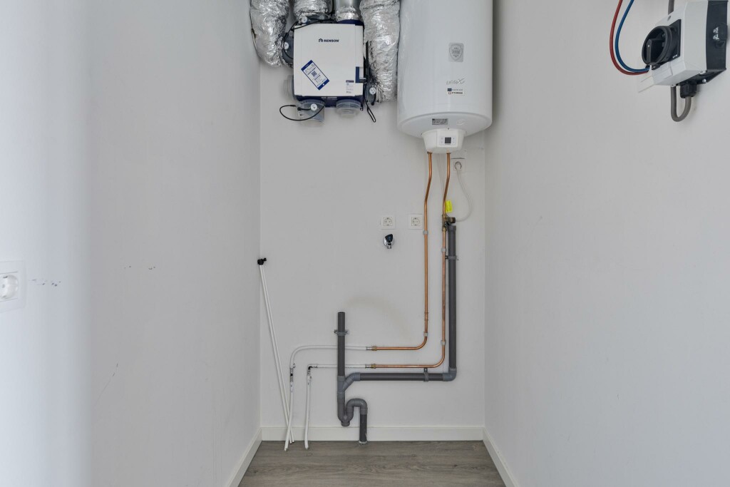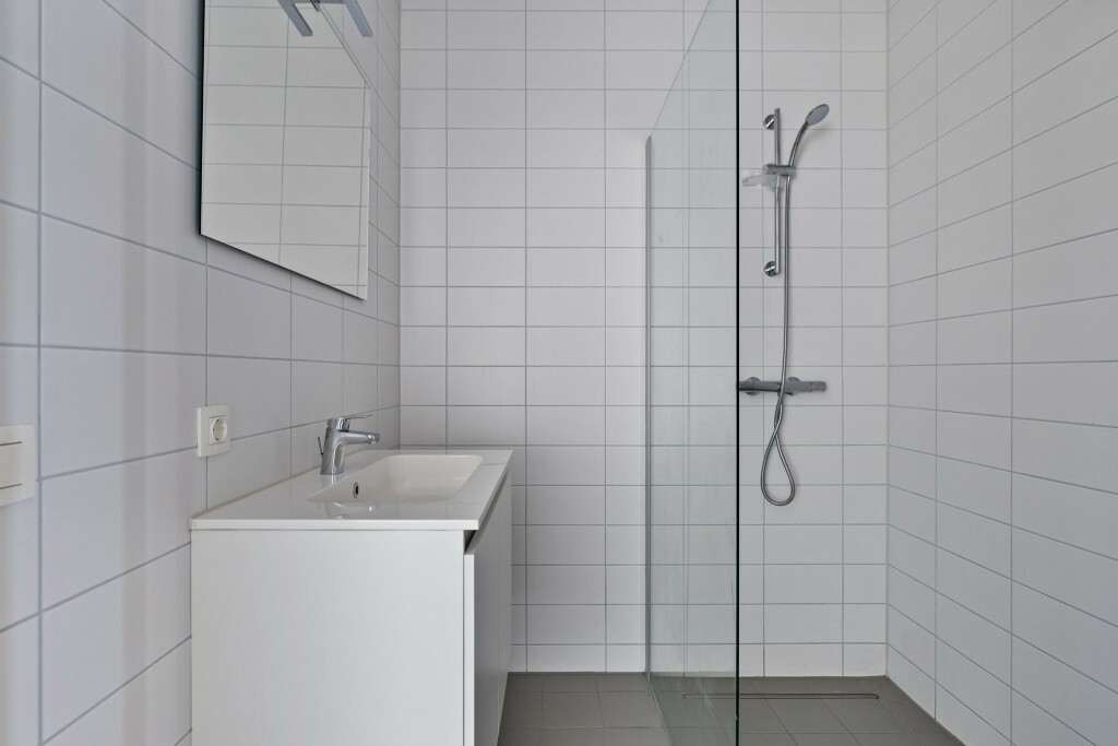 Bij binnenkomst tref je de meterkast en een apart hangtoilet. Verderop in de hal bevindt zich de moderne badkamer, uitgerust met een inloopdouche, een wastafel met meubel en spiegel. De tijdloze tegels zorgen voor een rustige en eigentijdse uitstraling. Een ruime slaapkamer met laminaatvloer.