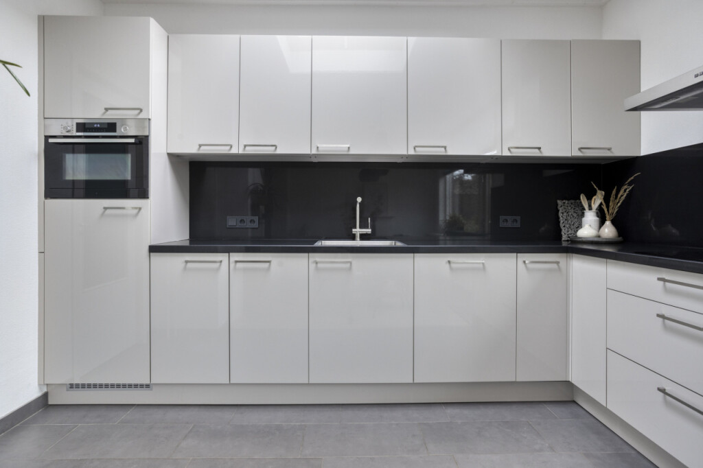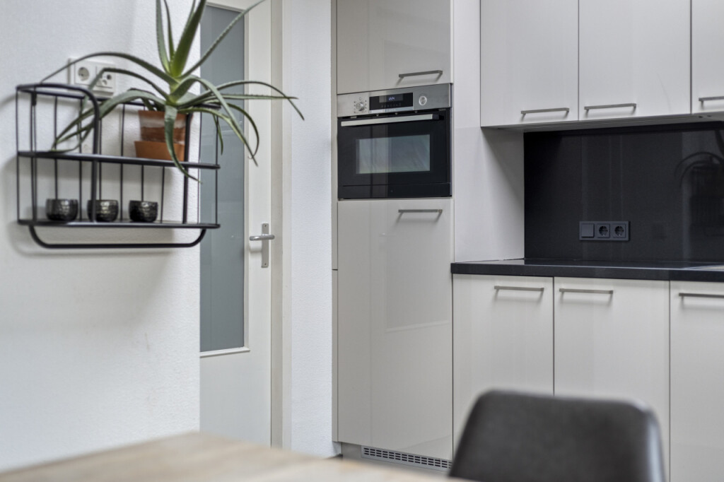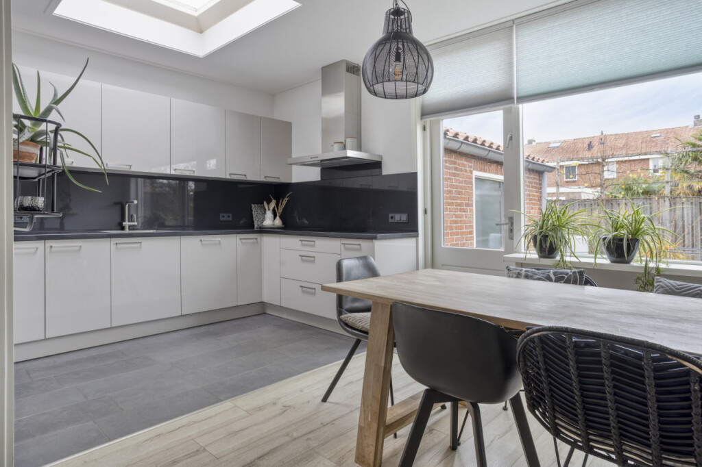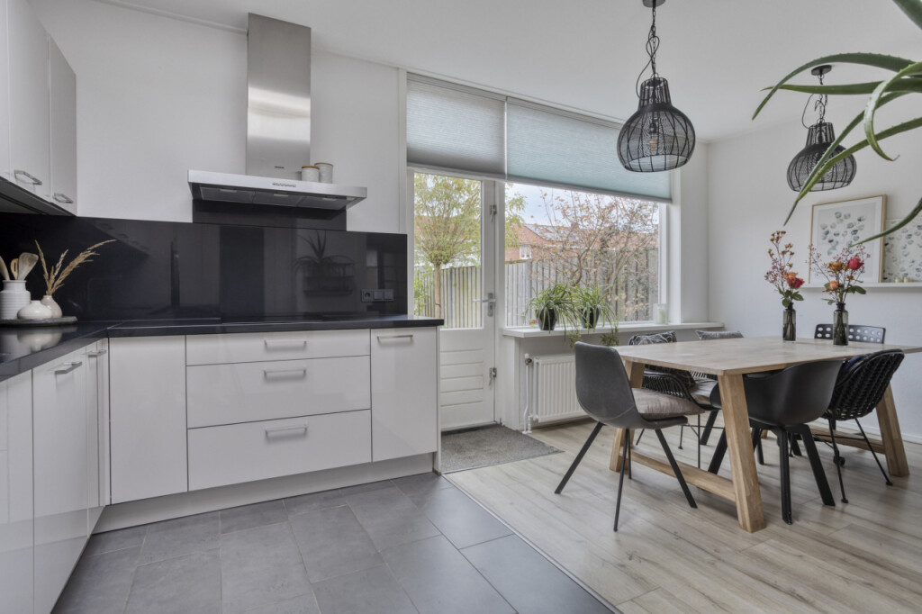 Op de begane grond kom je binnen in een nette hal die direct toegang geeft tot de trap naar boven, het toilet en de bijkeuken. Vanuit de hal stap je de woonkamer in, waar sfeervolle ensuite-deuren het leefgedeelte op een mooie manier opdelen. Aan de achterzijde ligt de open keuken, uitgevoerd in een lichte kleurstelling en voorzien van een groot raam dat uitkijkt over de tuin. Hier komt het daglicht royaal binnen en heb je tevens een deur naar buiten. Via een tweede deur bereik je de bijkeuken, ideaal voor de witgoedaansluitingen en extra bergruimte, waarna je weer terugkomt in de gang.
