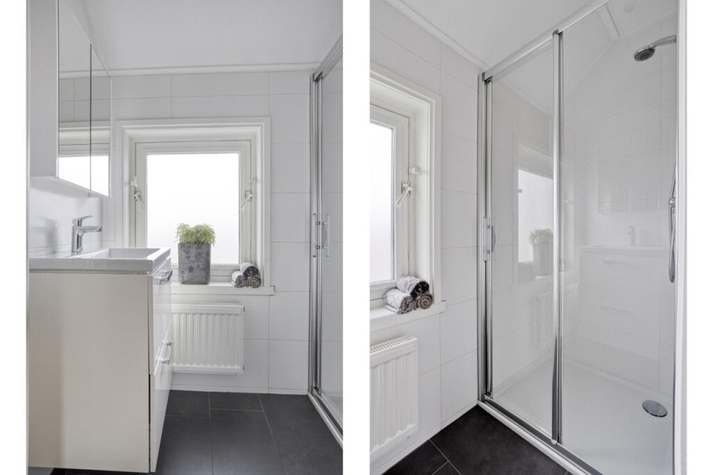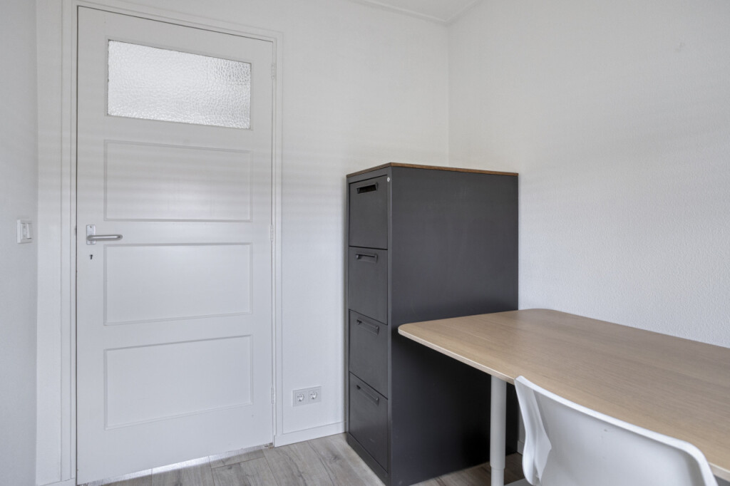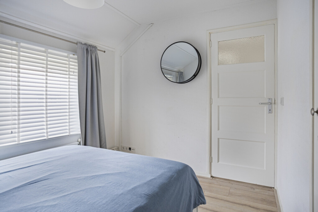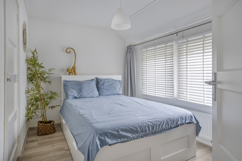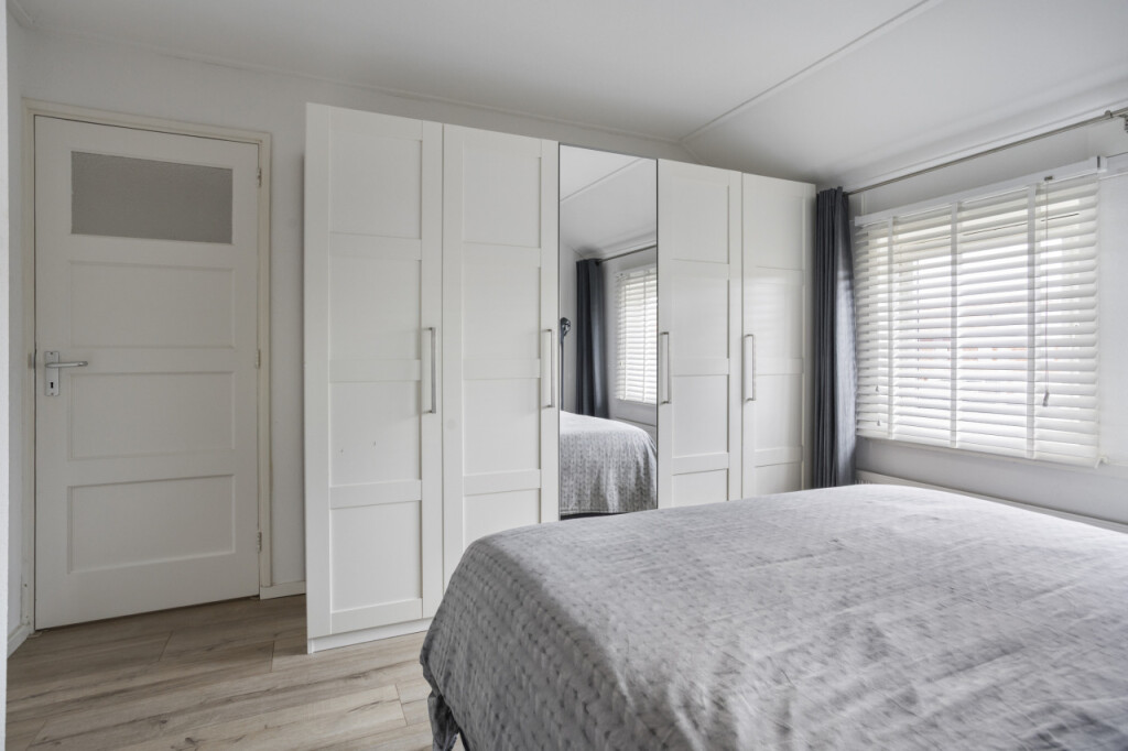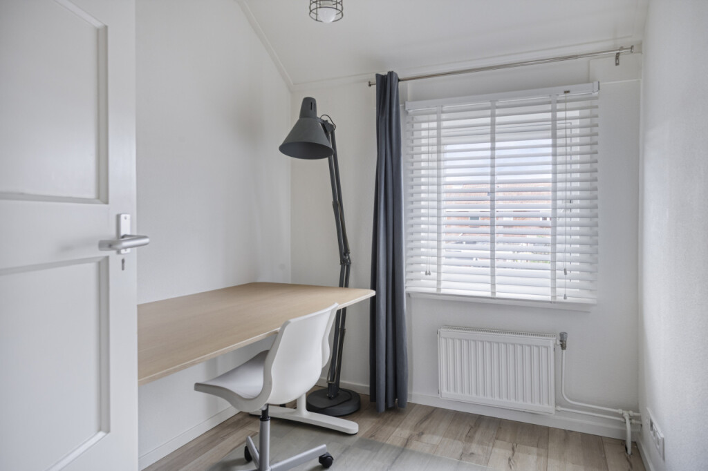 Op de eerste verdieping loopt de overloop door naar drie slaapkamers. De twee grootste kamers beschikken over vaste kasten, wat zorgt voor handige extra opbergruimte en rust in de kamers zelf. De badkamer is compact maar modern, netjes onderhouden en voorzien van een lichte afwerking, een douche en een wastafel met meubel.