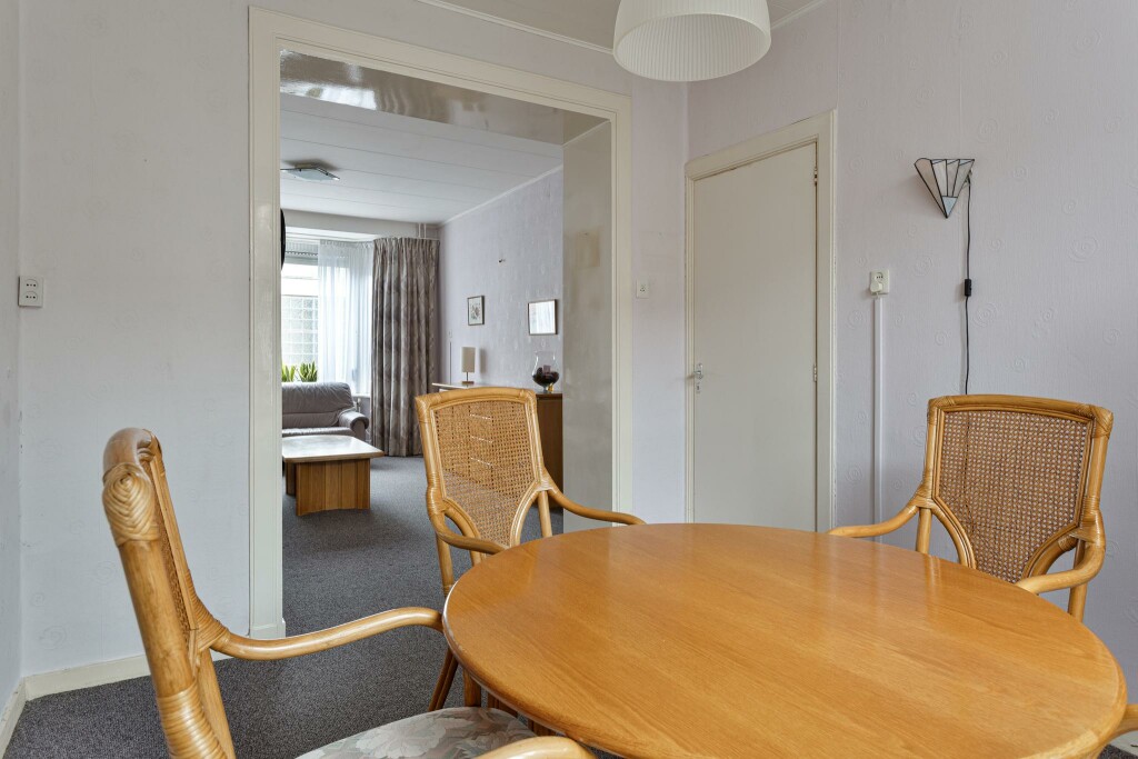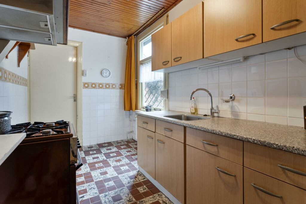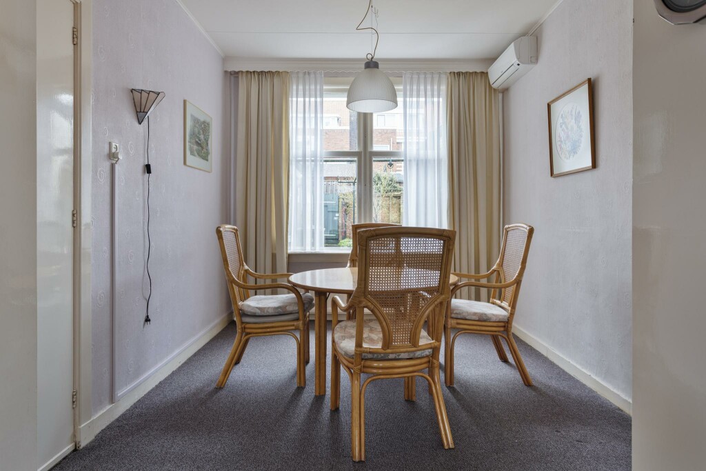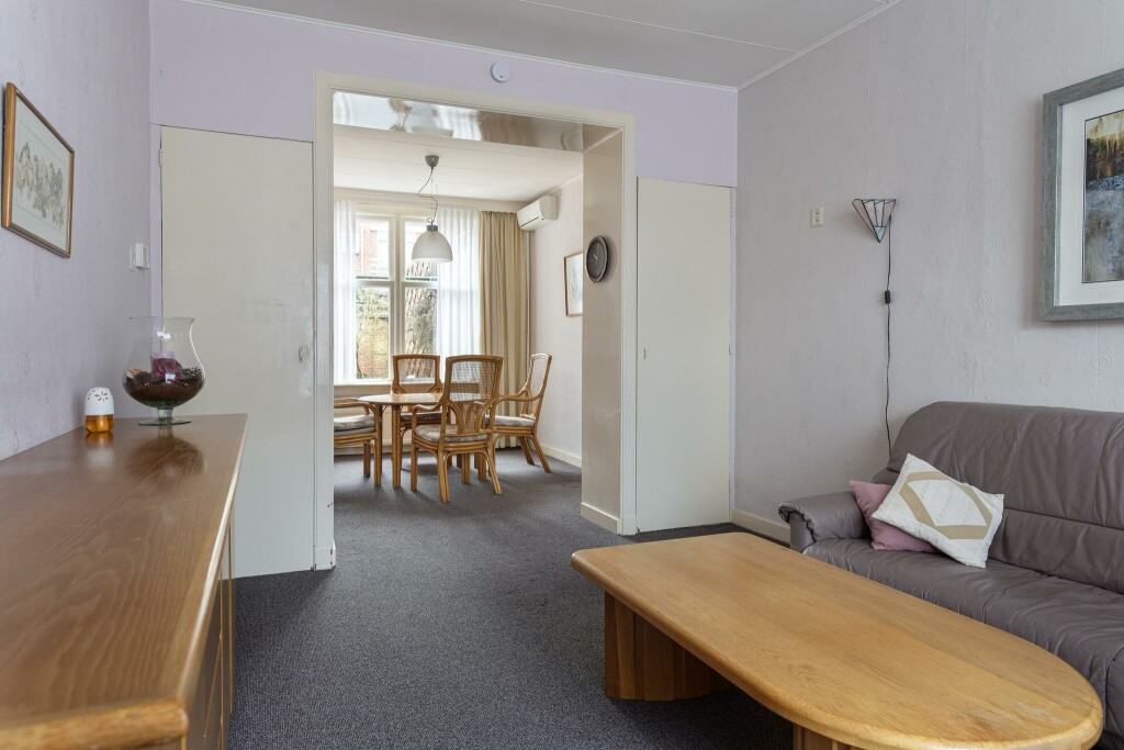 Bij binnenkomst word je verwelkomd in de hal, waar zich tevens het toilet bevindt. De woonkamer straalt karakter uit, mede door de leuke erker die zorgt voor veel lichtinval. Oorspronkelijk werd de woonkamer gescheiden van de eetkamer, wat nog steeds te zien is in de indeling. De keuken bevindt zich aan de achterzijde van de woning en grenst direct aan de bijkeuken. Vanuit hier loop je zo de tuin in.