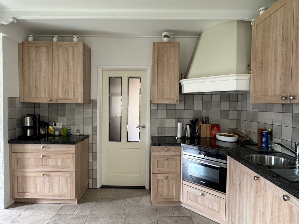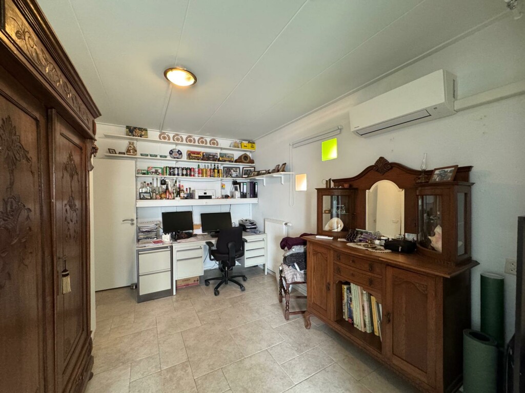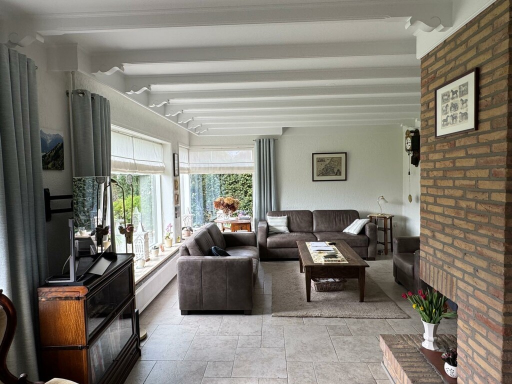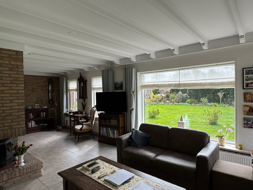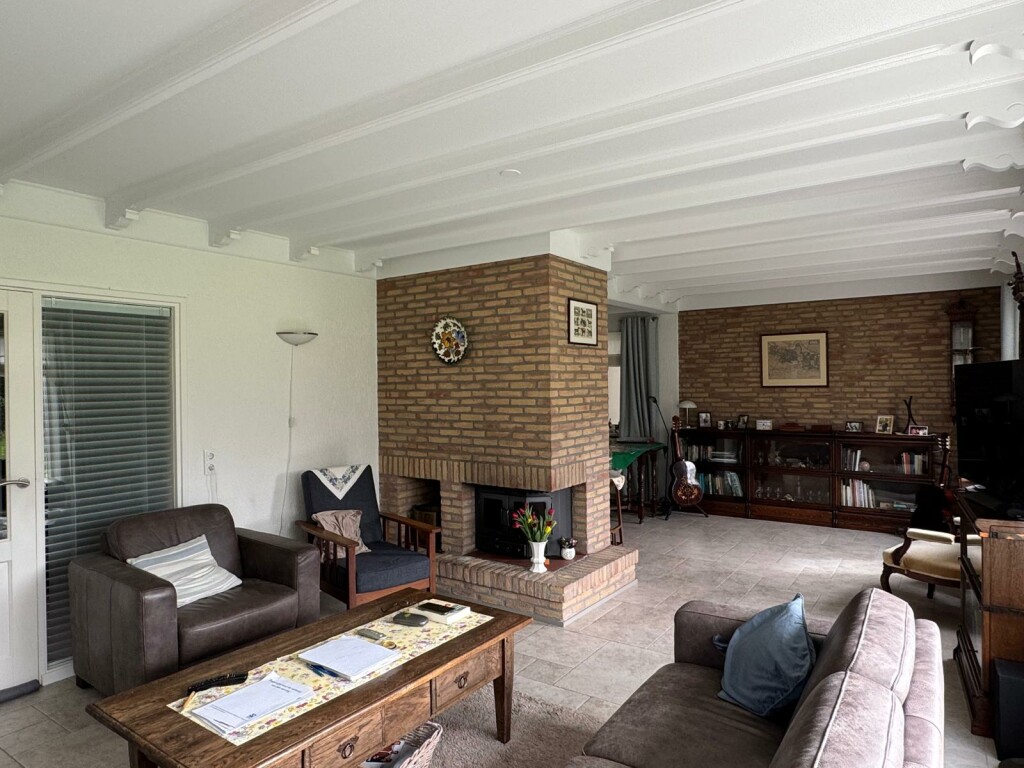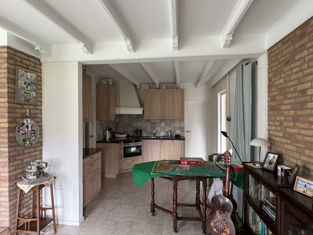 Hal met meterkast en toilet, woonkamer met open haard, half open keuken met inbouwapparatuur, tuinkamer die ook als eetkamer wordt gebruikt, bijkeuken met alle aansluitingen voor het witgoed, dubbele garage met beide een elektrische rolpoort waarvan de eerste via de keuken bereikbaar is, royale z-vormige slaapkamer met airco(Daikin), ruime badkamer met inloopdouche en wastafelmeubel