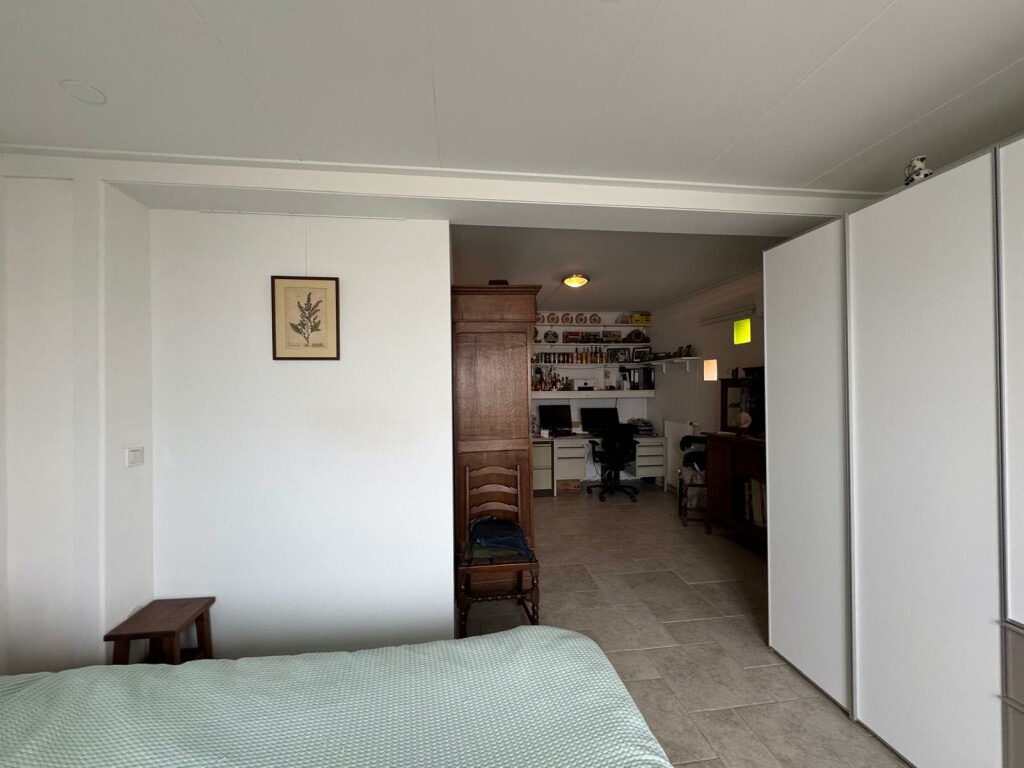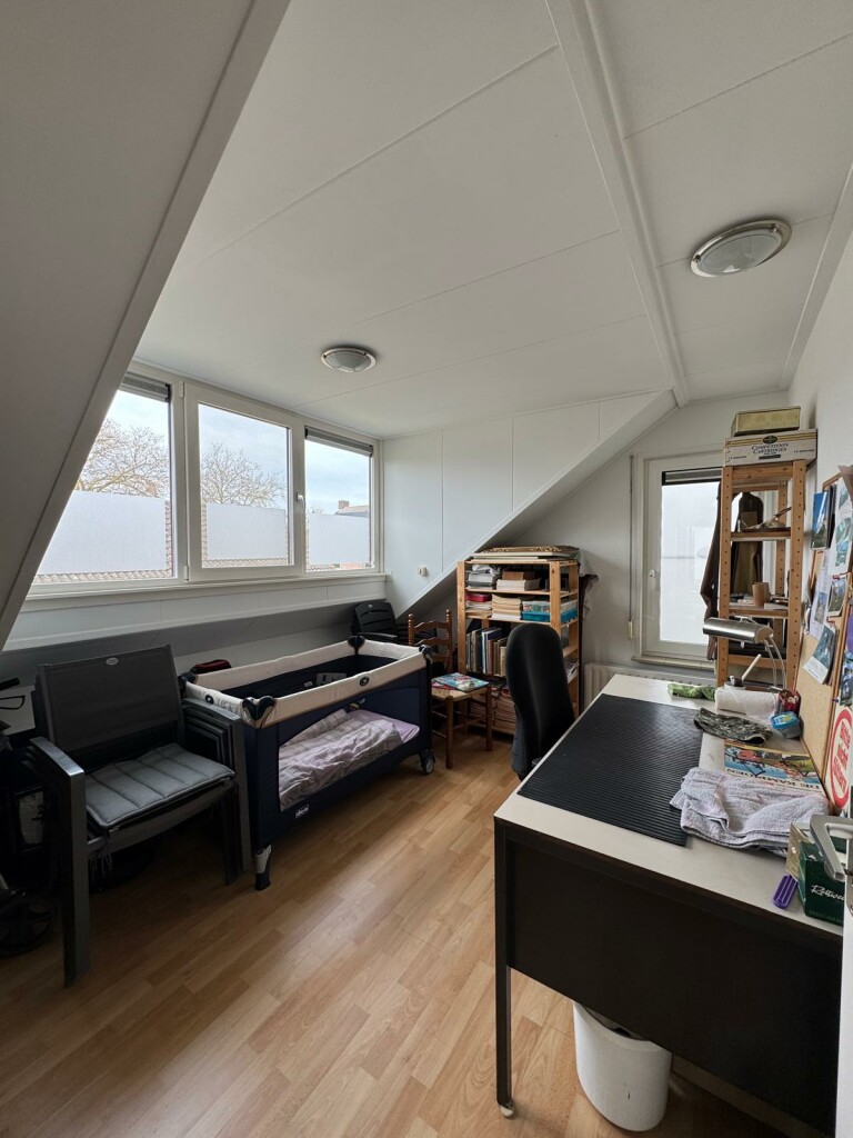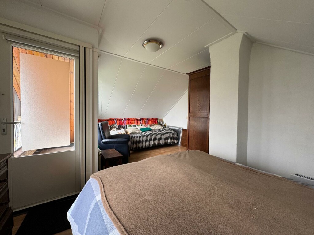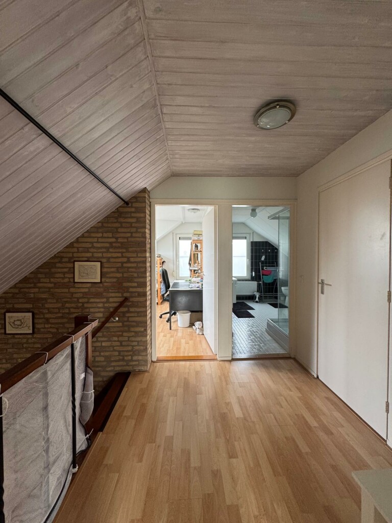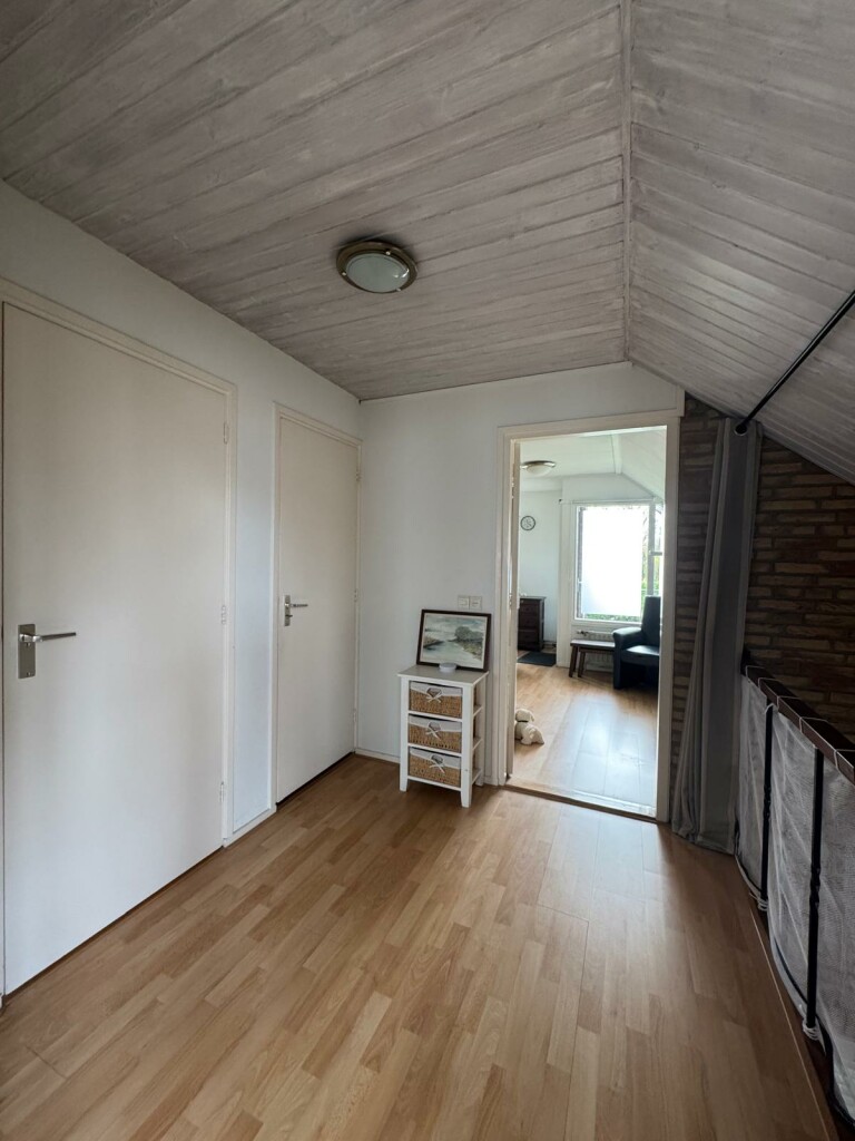 Ruime overloop met vide, 2 slaapkamers waarvan 1 slaapkamer met overdekt balkon op het zuiden, badkamer met douche cabine, toilet en wastafelmeubel met 2 wastafels, berging onder het dak (knieschotten) en c.v. ketel kamer met Intergas combi HR-ECO van 2016 en met omvormer voor de 10 zonnepanelen (2019) .