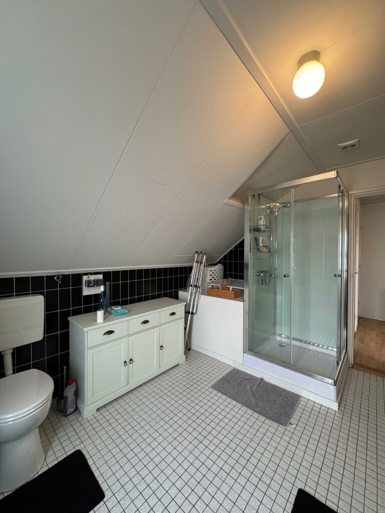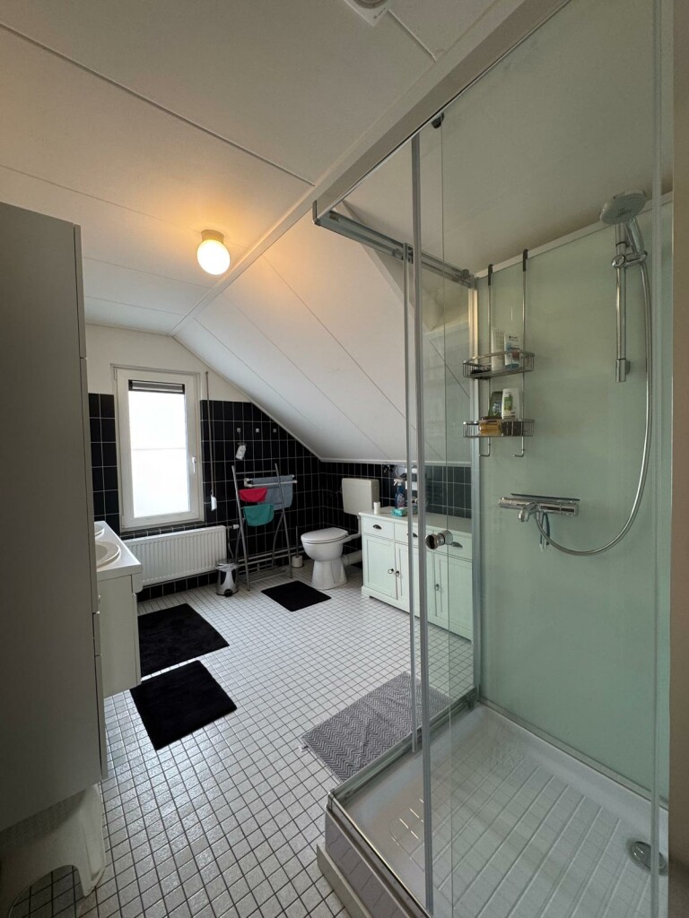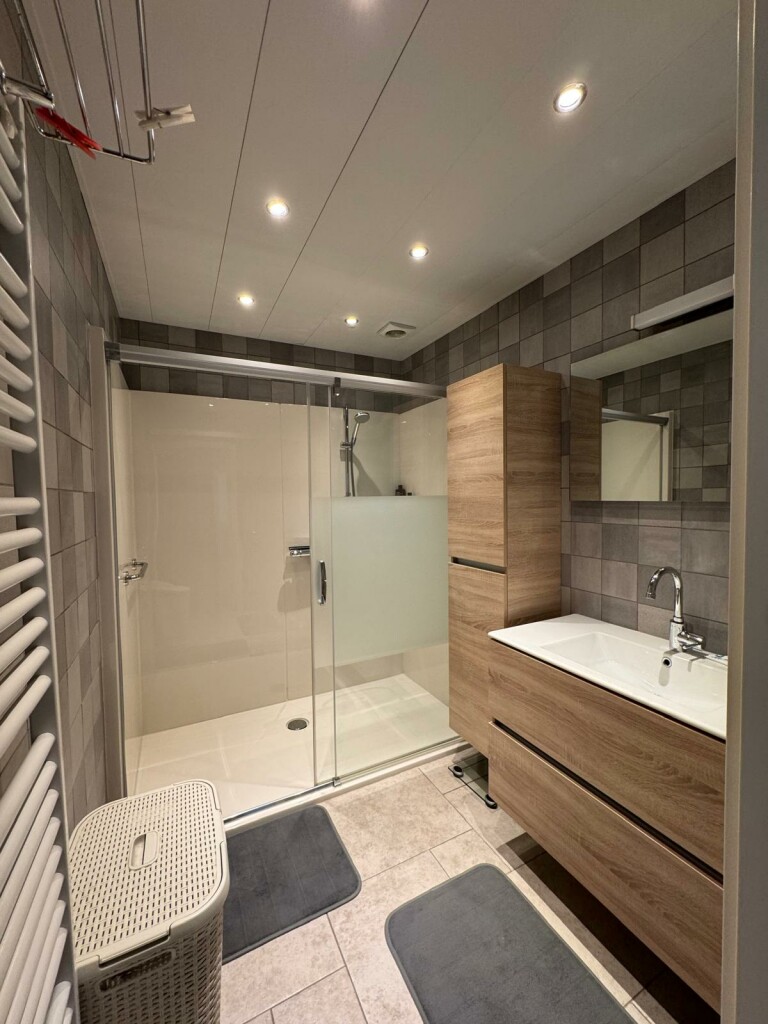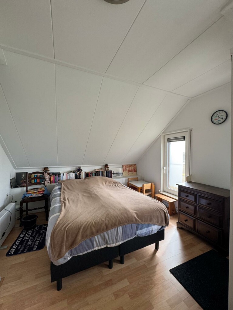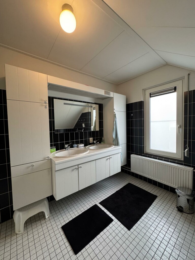 Ruime overloop met vide, 2 slaapkamers waarvan 1 slaapkamer met overdekt balkon op het zuiden, badkamer met douche cabine, toilet en wastafelmeubel met 2 wastafels, berging onder het dak (knieschotten) en c.v. ketel kamer met Intergas combi HR-ECO van 2016 en met omvormer voor de 10 zonnepanelen (2019) .