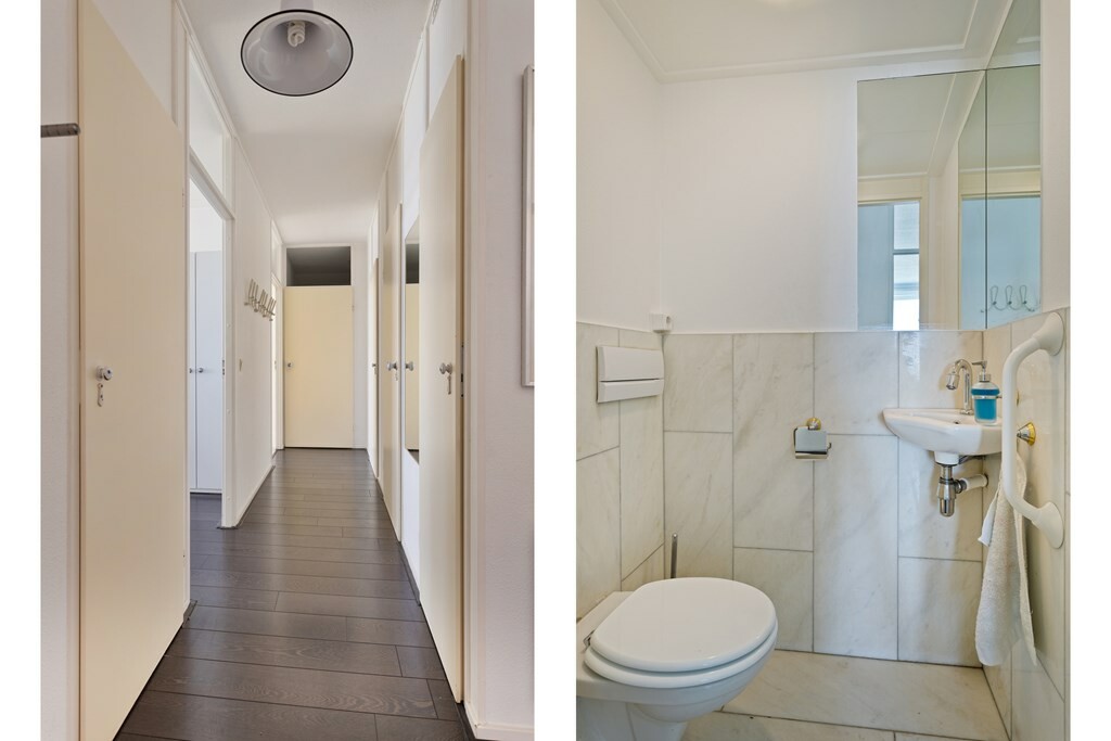Het appartement beschikt over twee ruime slaapkamers, beide voorzien van praktische inbouwkasten. De badkamer is verzorgd en functioneel. Daarnaast is er een apart toiletruimte en een wasruimte/berging met aansluitingen voor witgoed apparatuur.