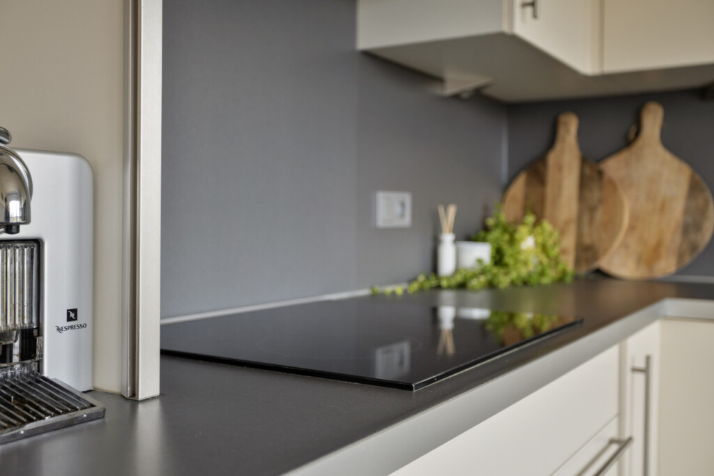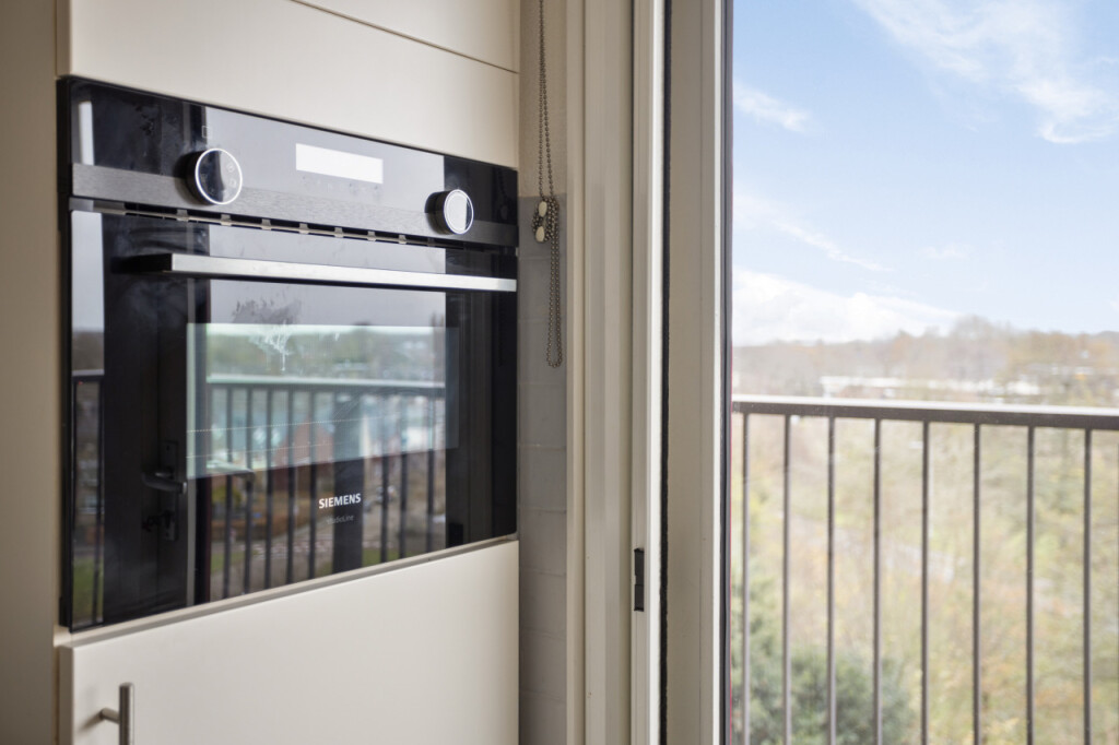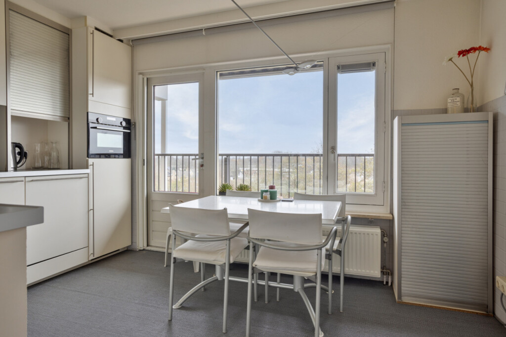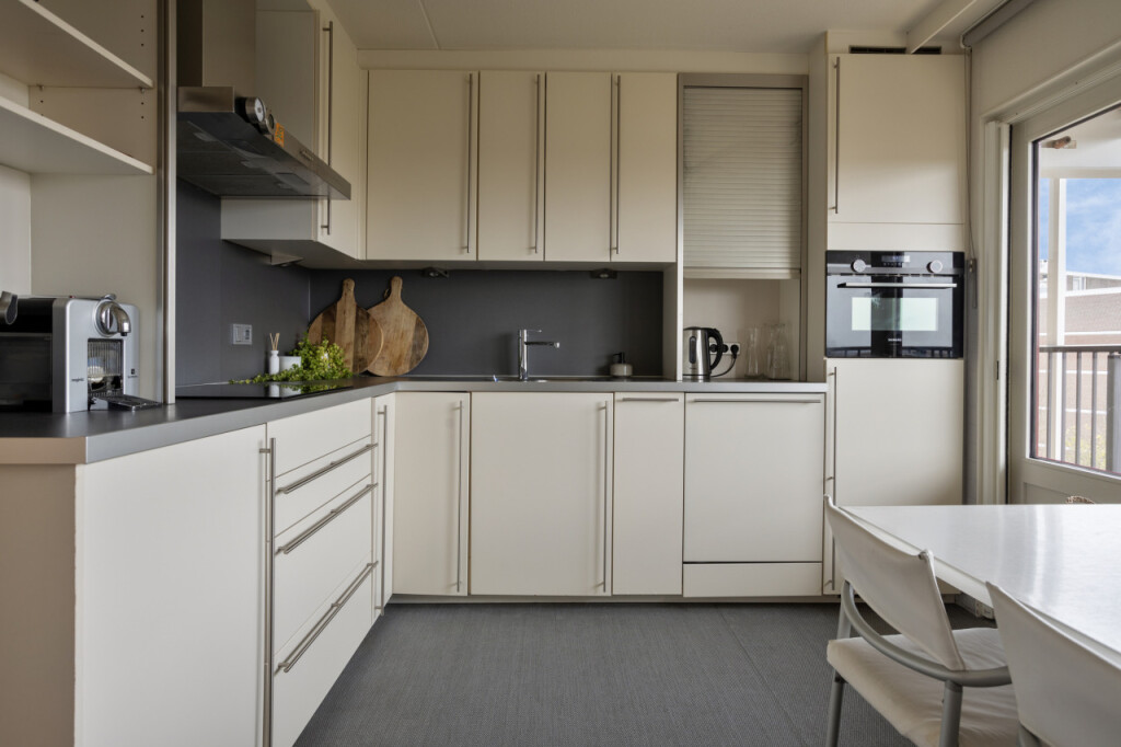 Nette woonkeuken aan de landzijde van het appartement met toegang tot het zonnige balkon gelegen op het zuiden.