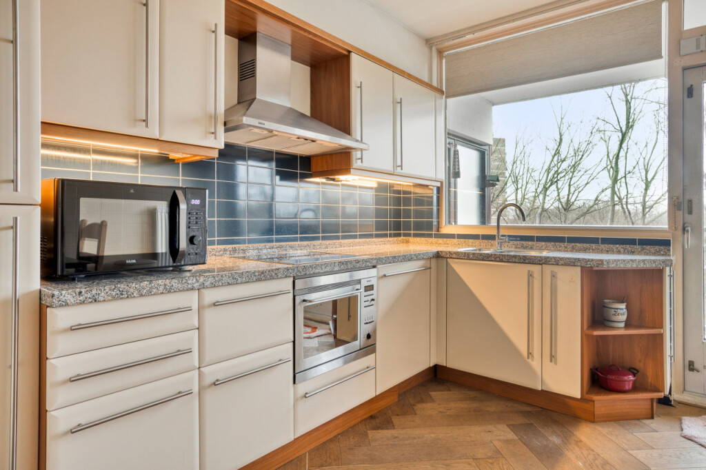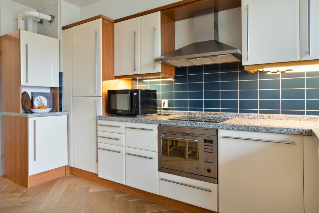 Entree in de ruime hal met garderobe, video-intercom, meterkast en ruime inbouwkast. Vanuit de hal een deur naar de ruime living met deur naar het balkon. Vanuit de woonkamer een open verbinding naar een werkkamer of eetkamer. De dichte eetkeuken heeft een hoekopstelling en is voorzien van een inductie kookplaat, afzuigkap, combi/oven, vaatwasser, koelkast en vriezer. Tevens vind u hier de c.v-installatie (Nefit ‘17). Vanuit de keuken een deur naar het balkon. Via een halletje achter de woonkamer is er toegang tot een royale master bedroom met vaste kastenwant en een 2e ruime slaapkamer. De moderne badkamer is vernieuwd en heeft een inloopdouche, wasmeubel en 2e toilet. Tevens treft u hier de wasmachineaansluiting en een boiler voor het warme water. Verder is er in deze hal nog een apart toilet.