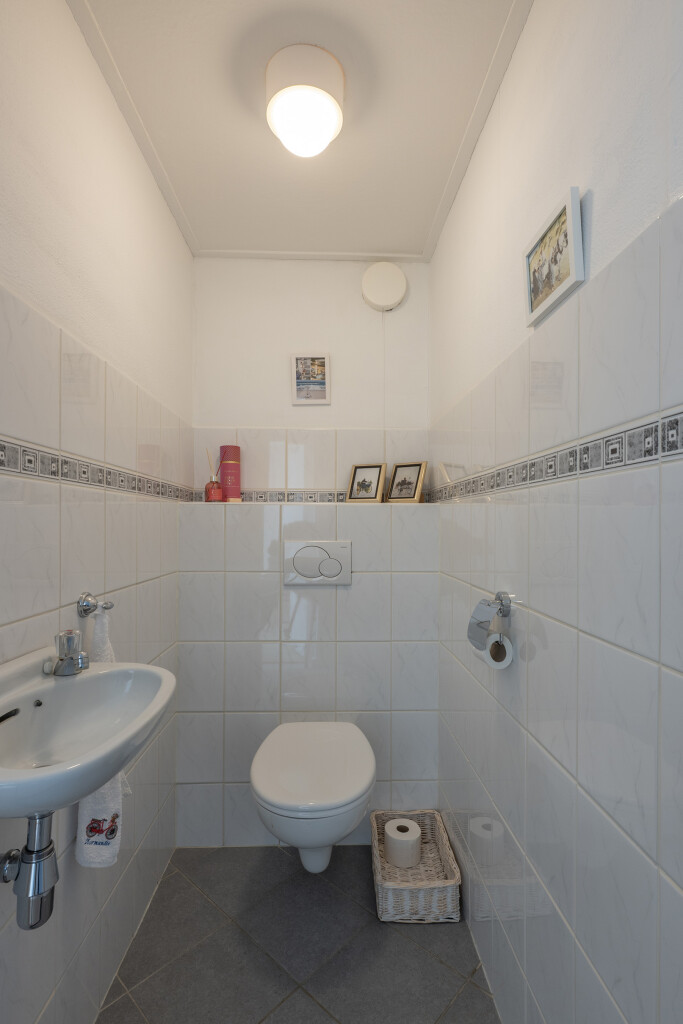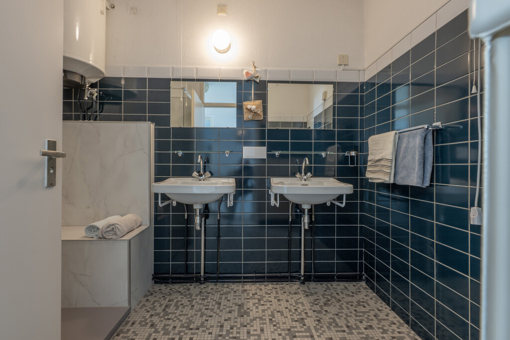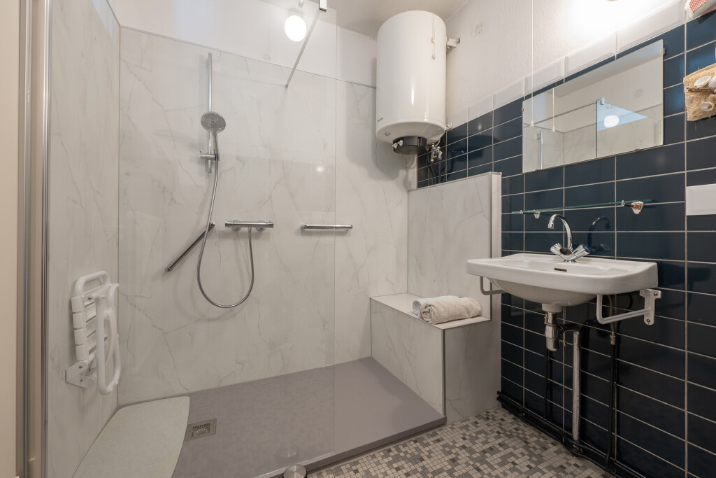 • Badkamer met inloopdouche (uitgerust met een opklapbaar douchestoeltje en handgreep, vernieuwd in voorjaar 2025), dubbele wastafel,
