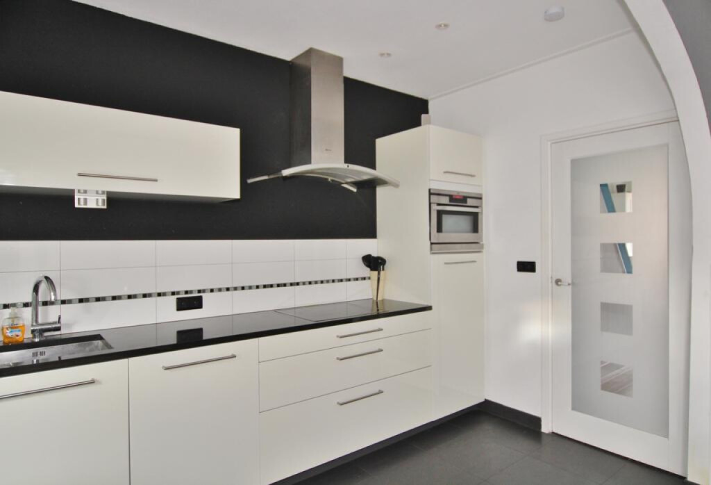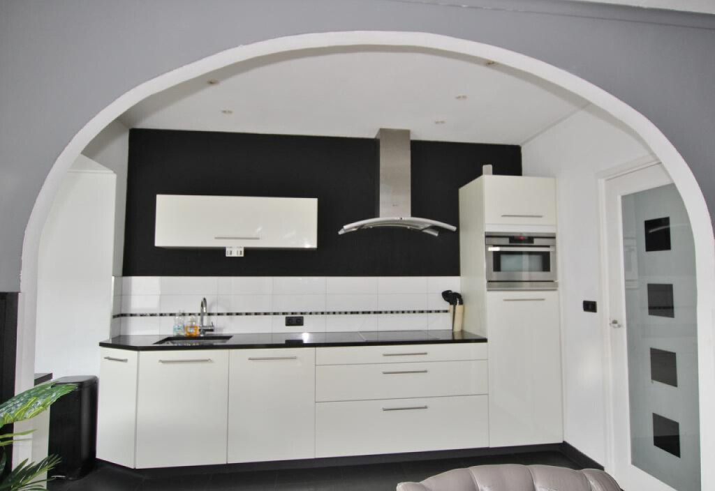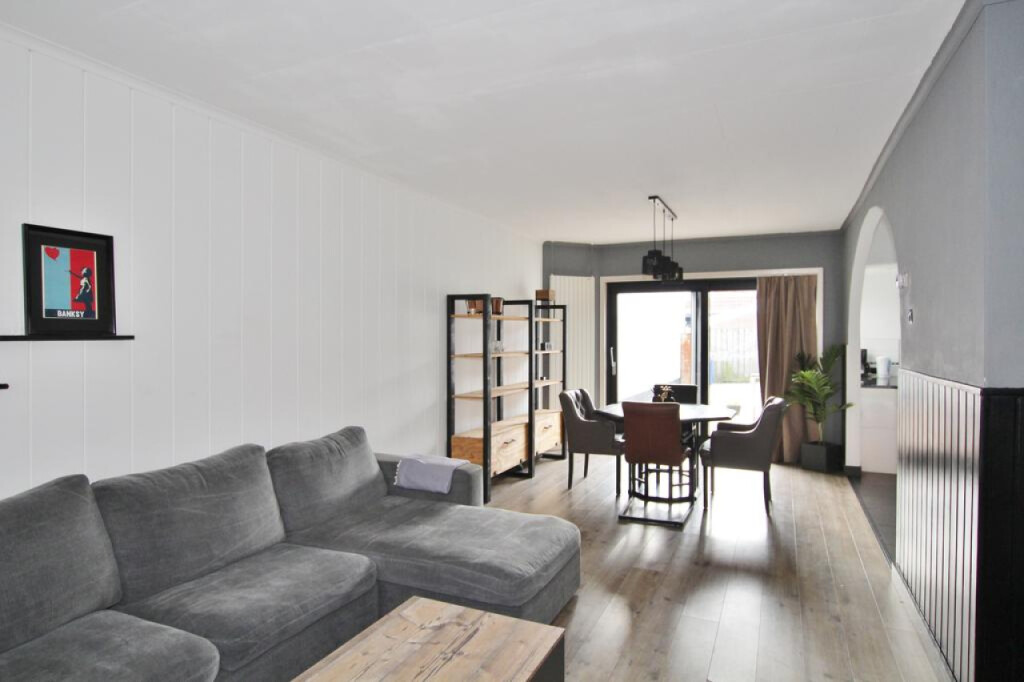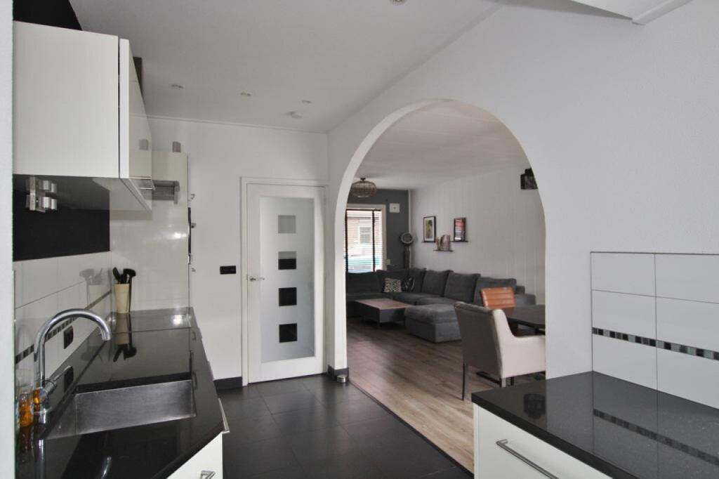 Hal met trap naar de eerste verdieping en trap-/kelderkast, sfeervolle woonkamer met schuifpui, open keuken met modern keukenblok met inbouwapparatuur (keramische kookplaat, afzuigkap, combi-magnetron, vaatwasser, koelkast en diepvries),halletje met achterdeur, apart toilet, volledig betegelde badkamer met douche en wastafel en een betegelde binnentuin.