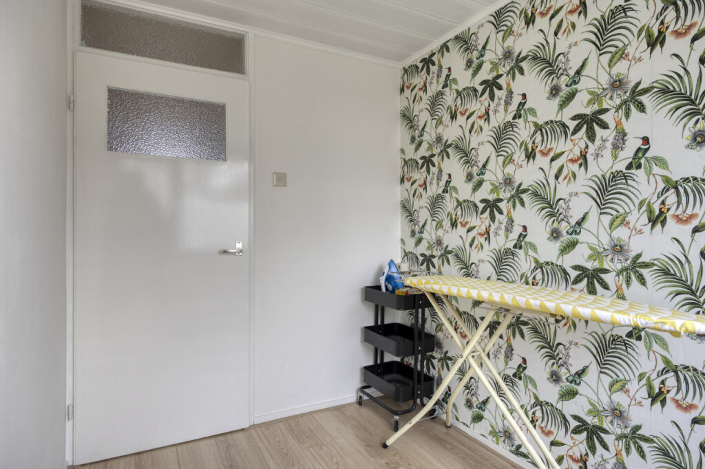 De ruime inkomhal biedt toegang tot het toilet, de meterkast, een praktische voorraadkast, de trap naar de eerste verdieping en de doorgang naar de woonkamer.