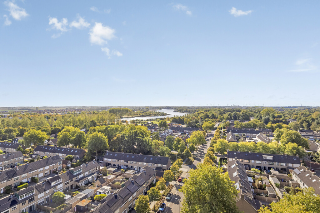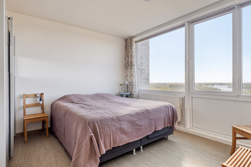 De ruime woonkamer is een echte eyecatcher, met uitzicht over water, stad en natuur. Grote raampartijen zorgen voor veel daglicht. De vloer is voorzien van een gevarieerde PVC-vloer, wat zorgt voor een speels effect. Vanuit de woonkamer is er toegang tot een balkon op het zuiden.