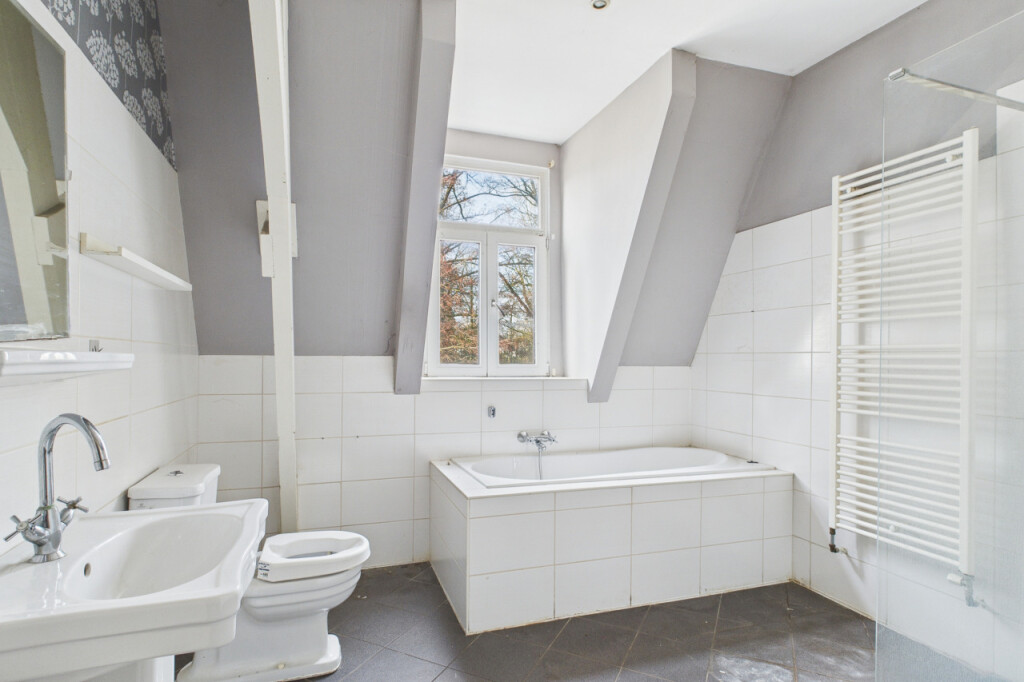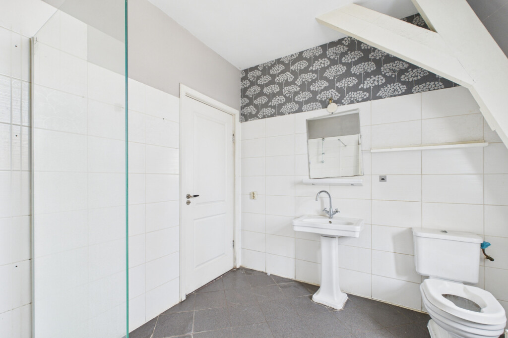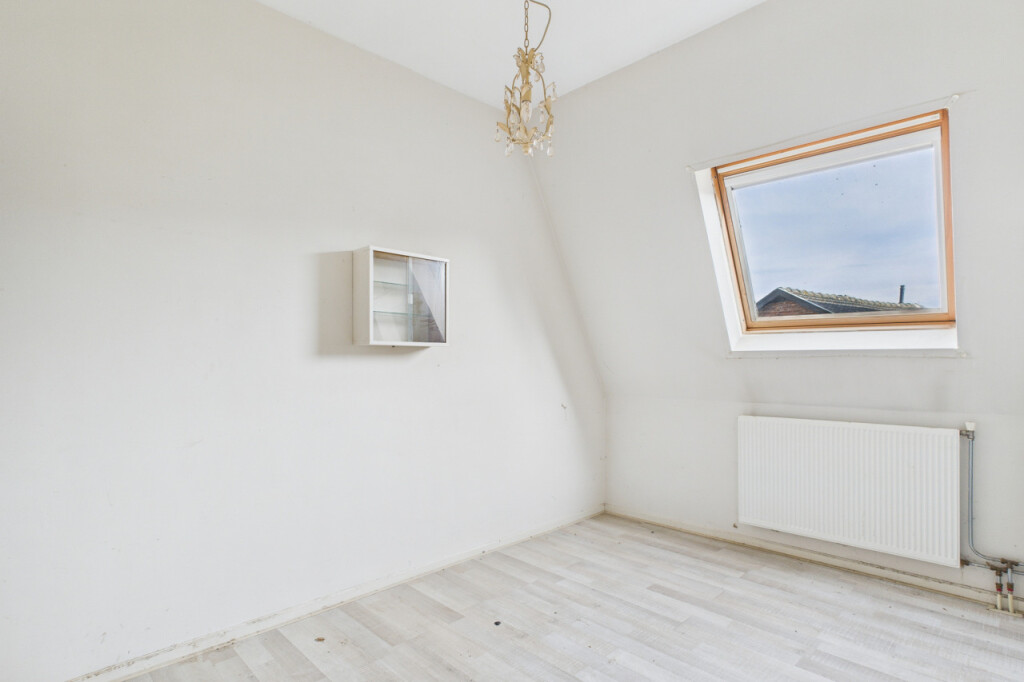 Op de eerste verdieping geeft de overloop toegang tot drie slaapkamers, die stuk voor stuk beschikken over een prettige lichtinval. De badkamer is ingericht met een ligbad, een inloopdouche, een wastafel en een toilet. Ook deze verdieping biedt een goede basis voor een eigentijdse herindeling of modernisering.