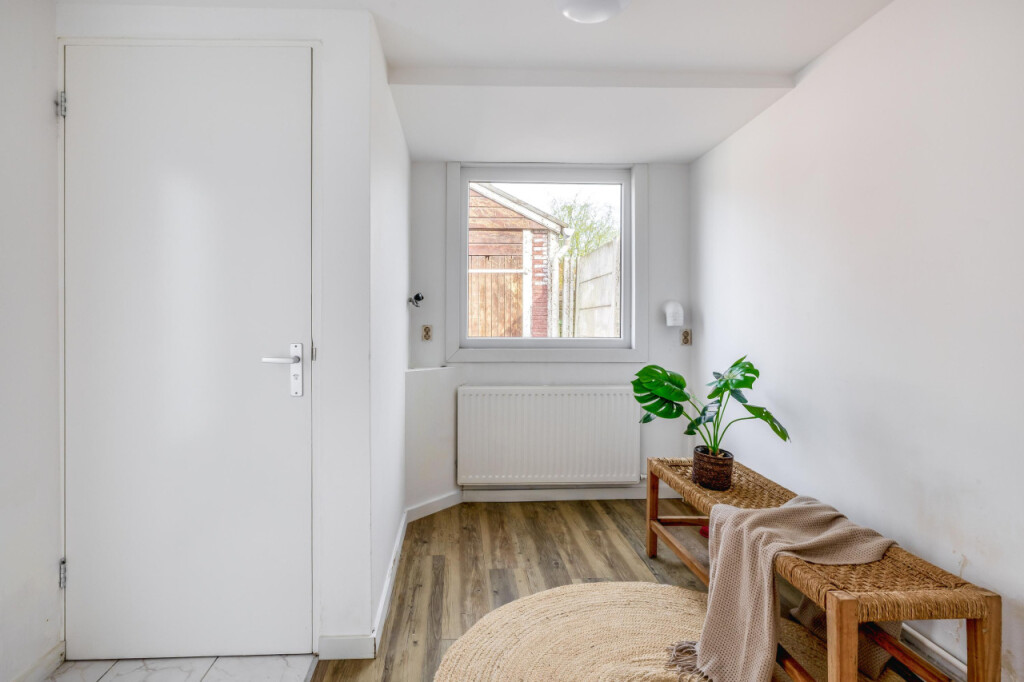Bij binnenkomst kom je in een ruime hal met de trapopgang naar de eerste verdieping en een praktische provisiekast onder de trap. Vanuit de hal bereik je de woonkamer, die zeer royaal is en het daglicht dat rijkelijk naar binnen valt. Ook vanuit de hal is de gesloten keuken toegankelijk, welke recent is vernieuwd en een verzorgde, moderne uitstraling heeft. Aansluitend bevindt zich de bijkeuken, waar tevens het toilet is gesitueerd en van waaruit je verder richting de tuin kunt.