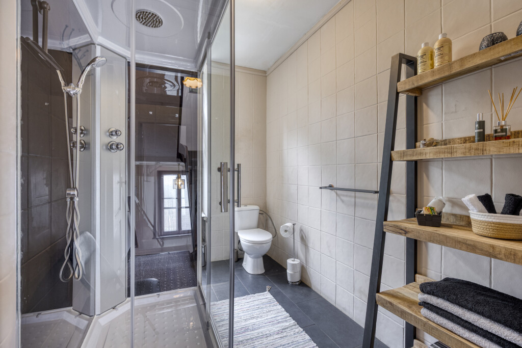 De tweede verdieping is bereikbaar via een vaste trap en biedt nog meer woonruimte. Hier bevindt zich een extra woonkamer met eenvoudig keukenblok en een aparte slaapkamer, evenals een tweede badkamer met douchecabine, wastafelmeubel en toilet. Deze verdieping is ideaal als gastenverblijf, voor oudere kinderen of om te gebruiken als werkruimte.