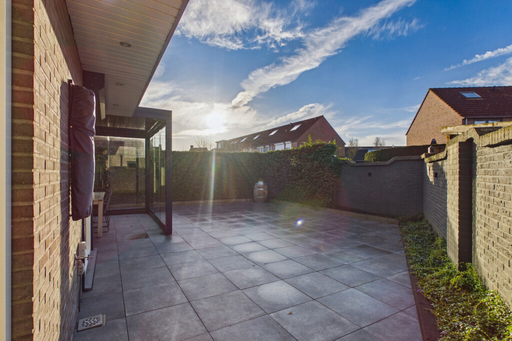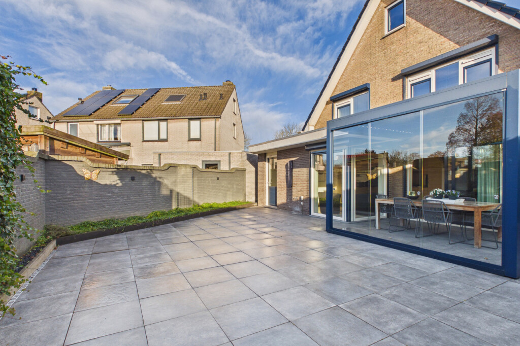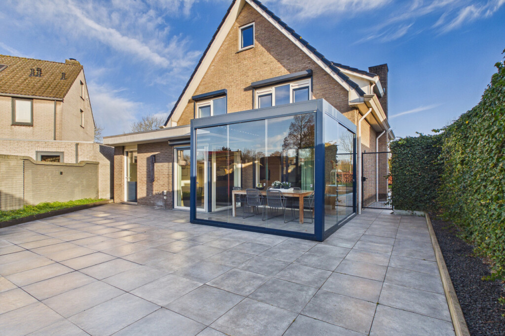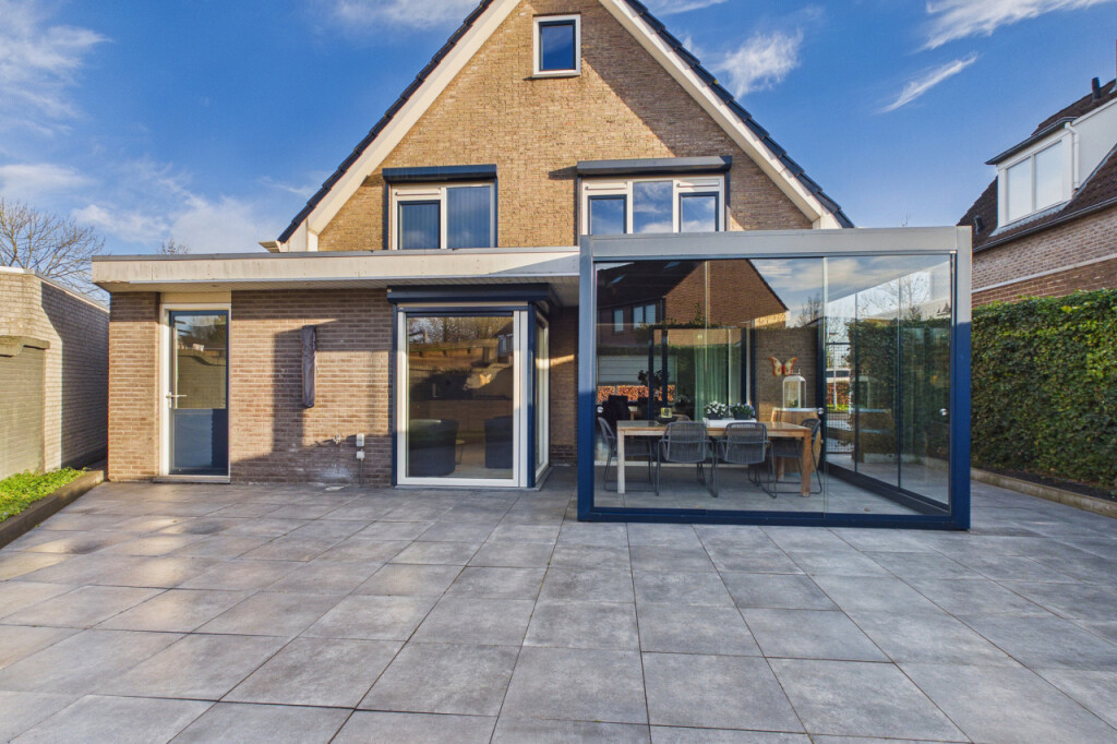 De achtertuin is onderhoudsvriendelijk aangelegd en beschikt over een modern terras waar je volop van de zon kunt genieten. De tuin ligt gunstig op het zuiden, waardoor je vrijwel de hele dag zon hebt. De mooie afsluitbare overkapping, voorzien van glazen wanden, zorgt ervoor dat je hier ook bij minder weer comfortabel buiten kunt zitten. Dankzij de eigen achterom is de tuin bovendien gemakkelijk bereikbaar.