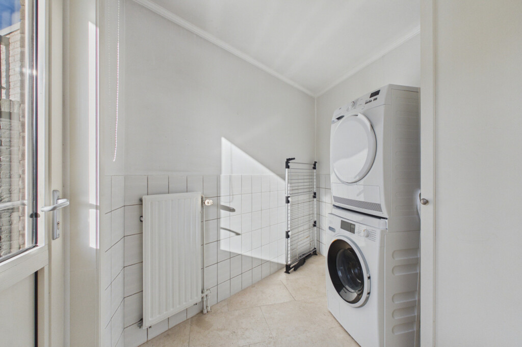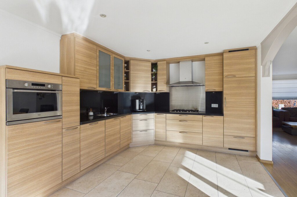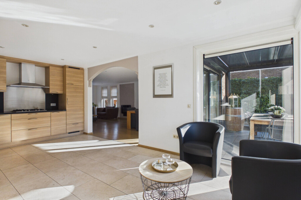 Je komt de woning binnen in de hal met garderobenis, toilet met fonteintje en trapopgang naar de eerste verdieping. Vanuit de hal heb je tevens toegang tot de ruime garage. Wanneer je doorloopt, stap je de royale woonkamer binnen. Hier valt direct de fijne lichtinval op dankzij de grote raampartijen. De sfeervolle, elektrische haard vormt een warm middelpunt in de ruimte en maakt dit een heerlijke plek om te zitten. Aansluitend bevindt zich de grote woonkeuken, geplaatst in een praktische hoekopstelling en voorzien van alle benodigde inbouwapparatuur, waaronder een gaskookplaat, afzuigkap, combi-oven, vaatwasser, koelkast, vriezer en spoelbak. Achter de keuken ligt de bijkeuken met aansluitingen voor witgoedapparatuur en een loopdeur naar de achtertuin.