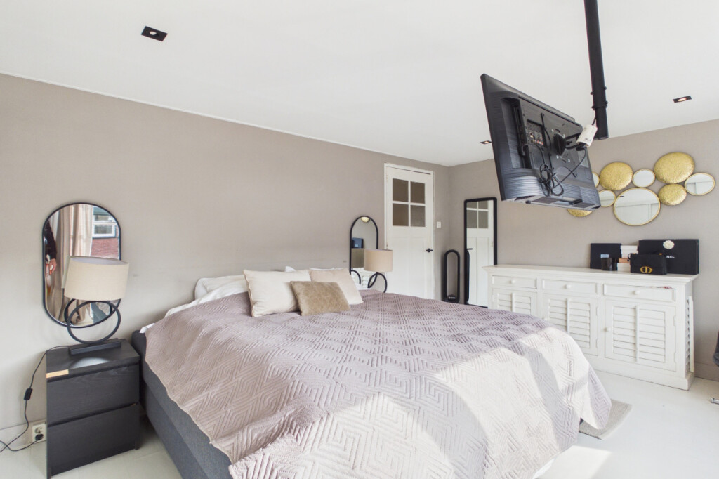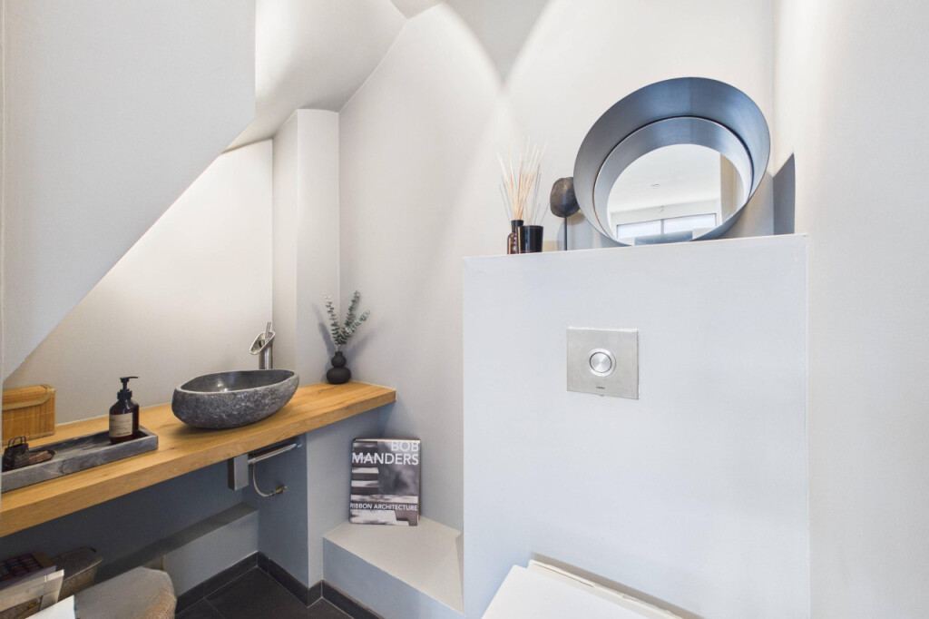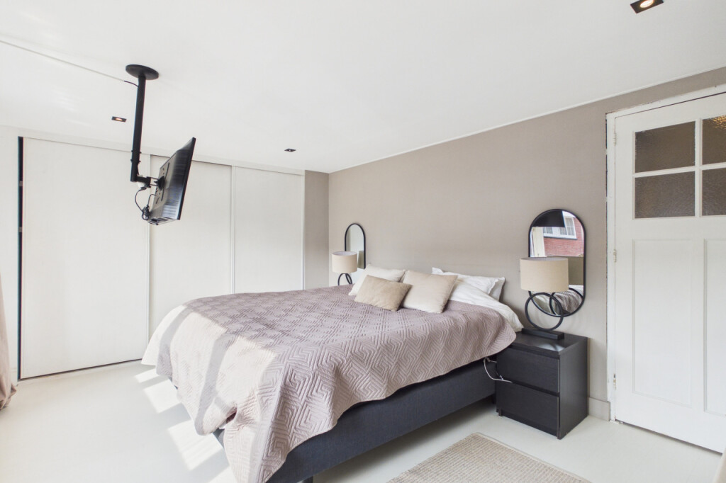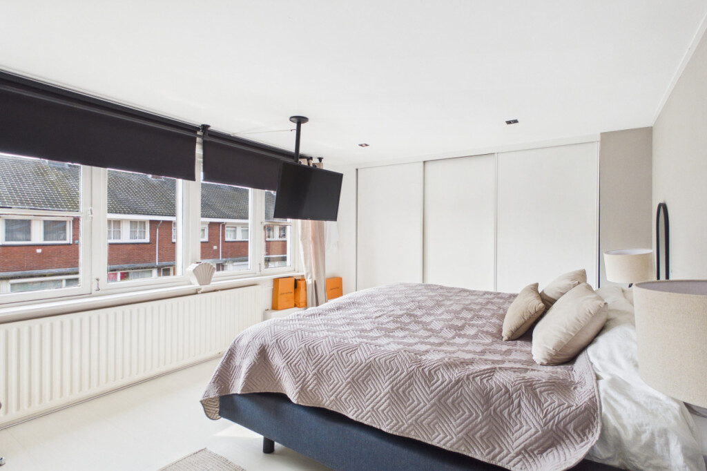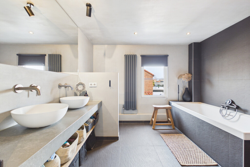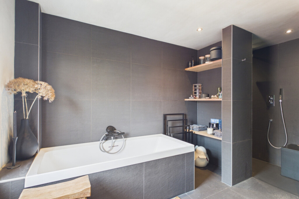Op de eerste verdieping vind je drie ruime slaapkamers en een luxe badkamer. De badkamer is strak en compleet uitgevoerd met inloopdouche, ligbad, dubbele wastafel met meubel en een tweede toilet. Alles in een rustige, hoogwaardige afwerking.