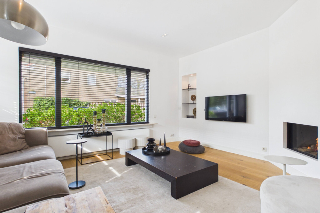De woonkamer is warm en uitnodigend. Veel daglicht, een mooie houten vloer en een gashaard maken dit een plek waar je graag thuiskomt.
