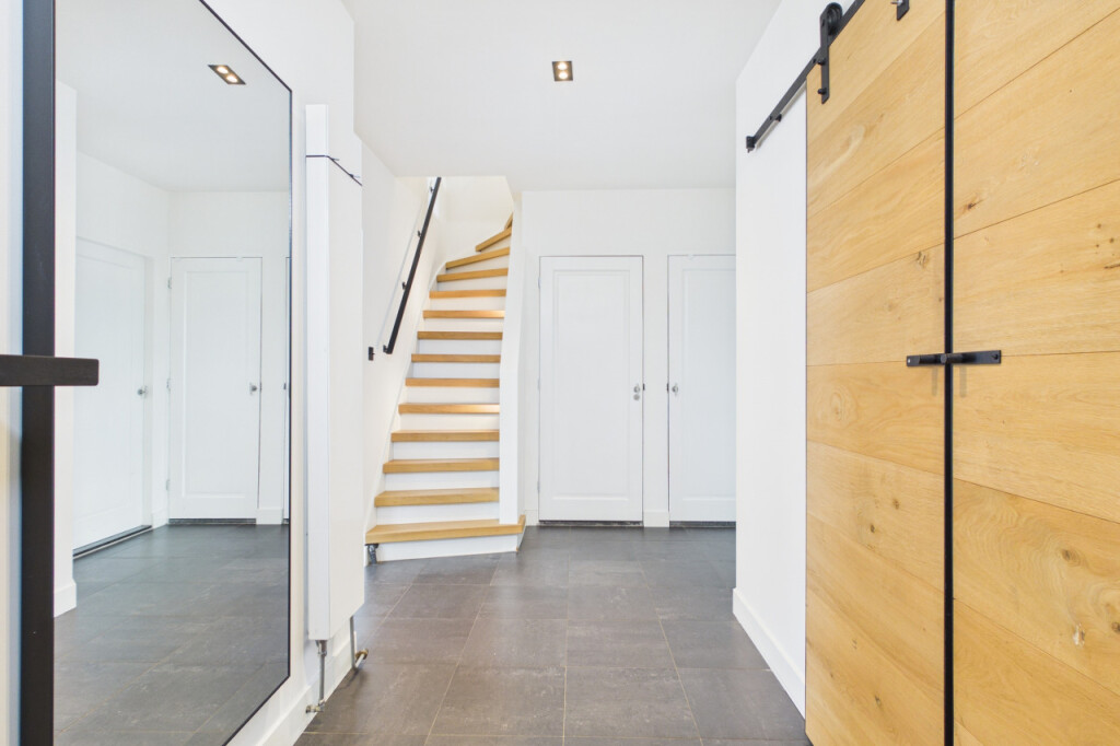 Je komt binnen in een verzorgde hal met garderobekast, modern toilet en een fraaie trapopgang die meteen het karakter van de woning laat zien.