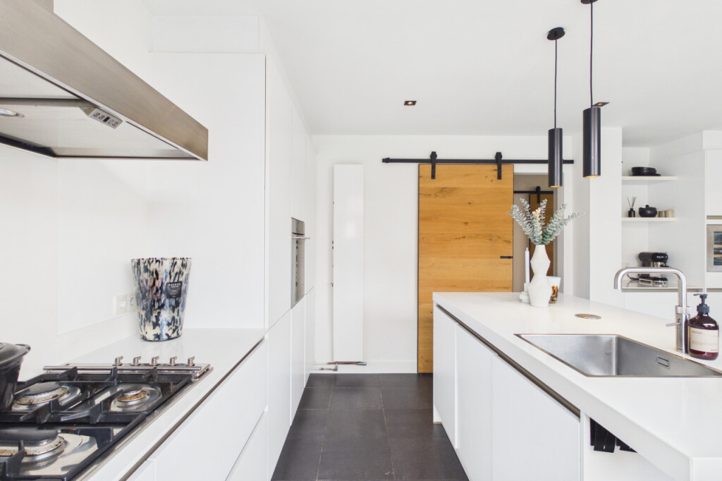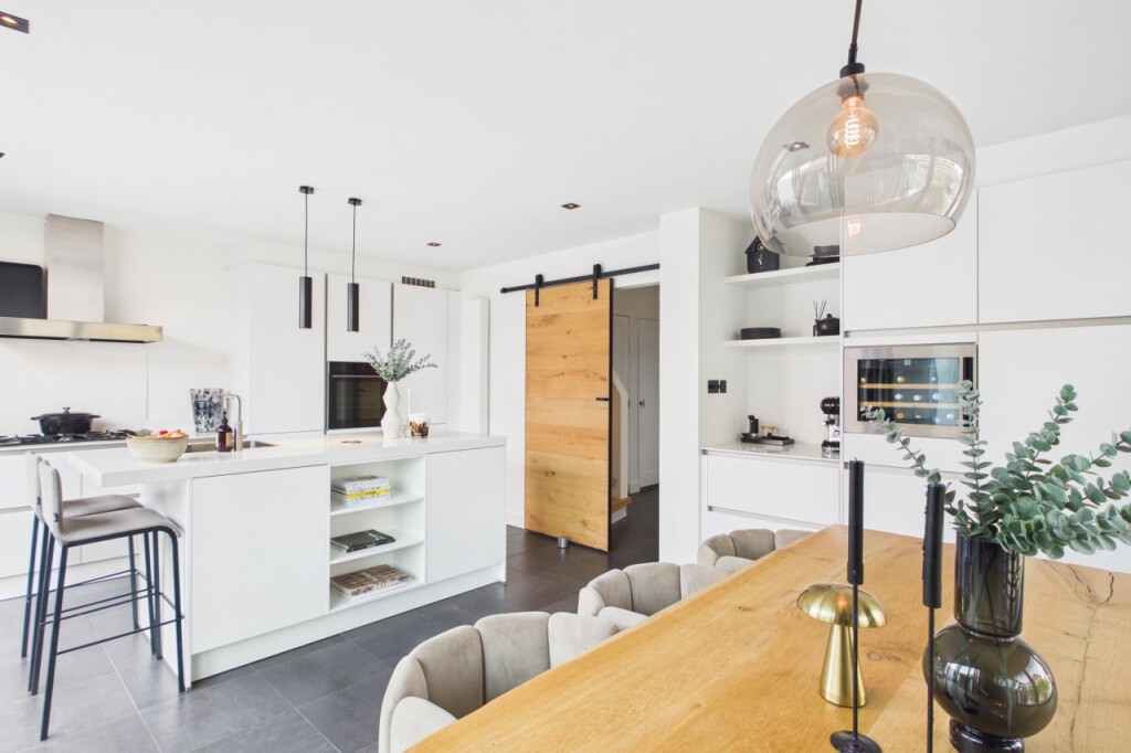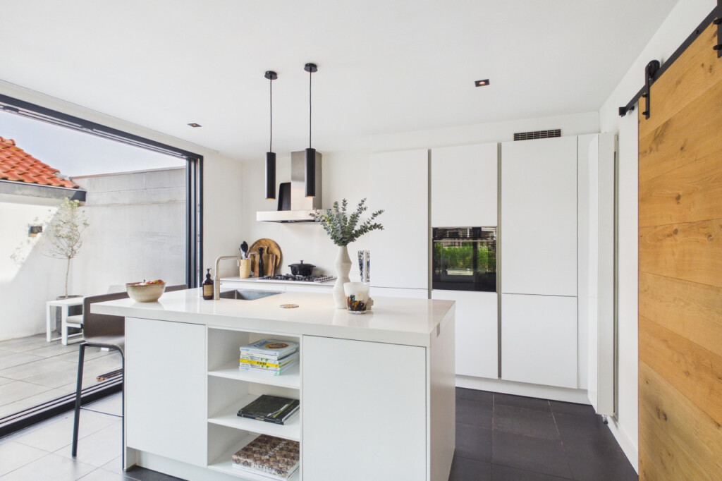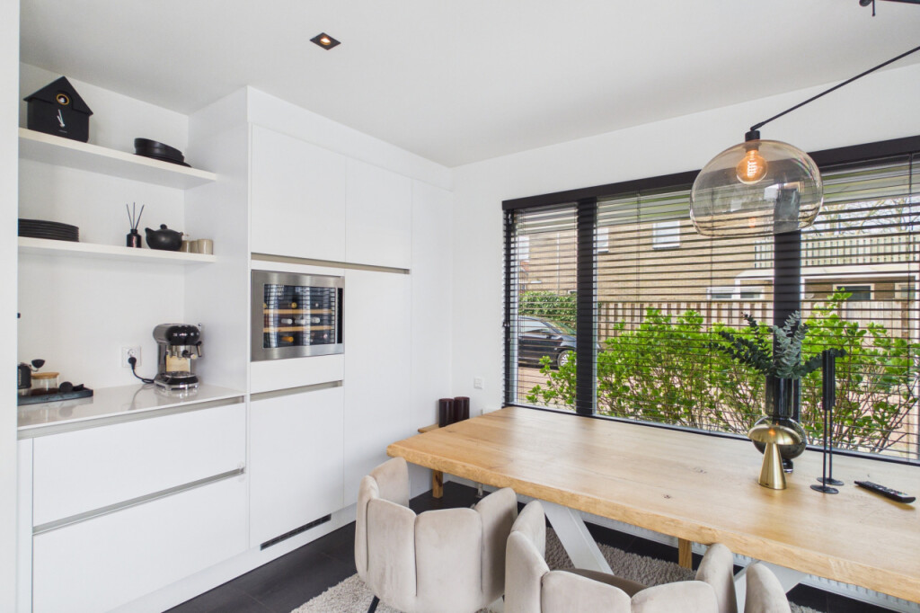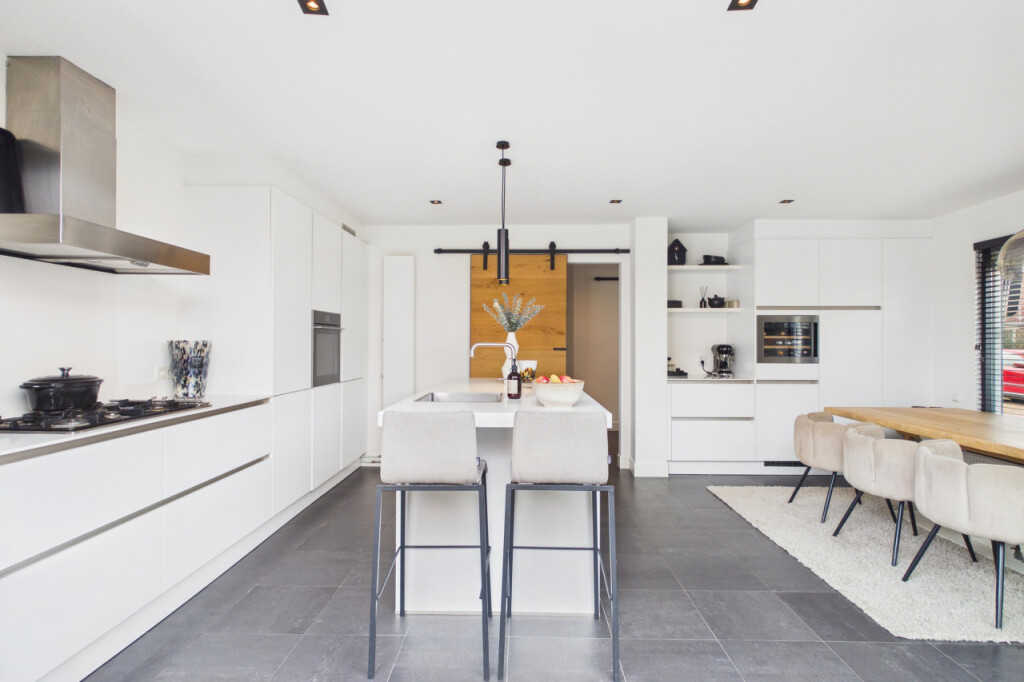 Aan de achterzijde ligt de royale woonkeuken. Een echte leefruimte met maatwerk keuken, spoeleiland, apparatuurwand met koffiecorner en een wijnklimaatkast. Uiteraard voorzien van alle inbouwapparatuur. Hier kook je niet alleen, hier zit je samen te genieten!