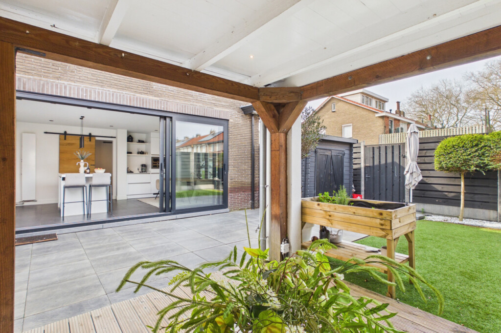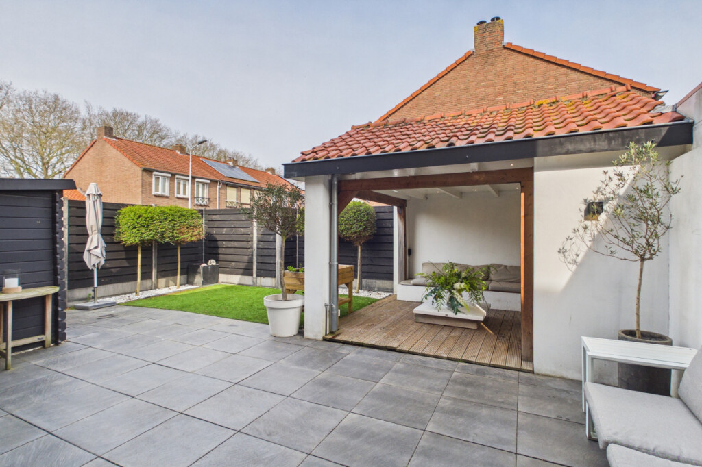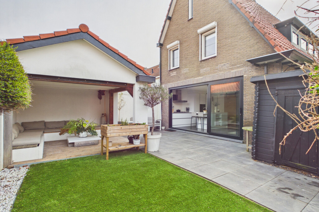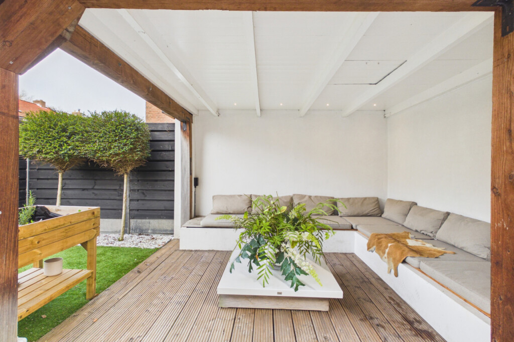 Via de keuken stap je de tuin in, waar een gezellige terrasoverkapping zorgt voor lange avonden buiten.