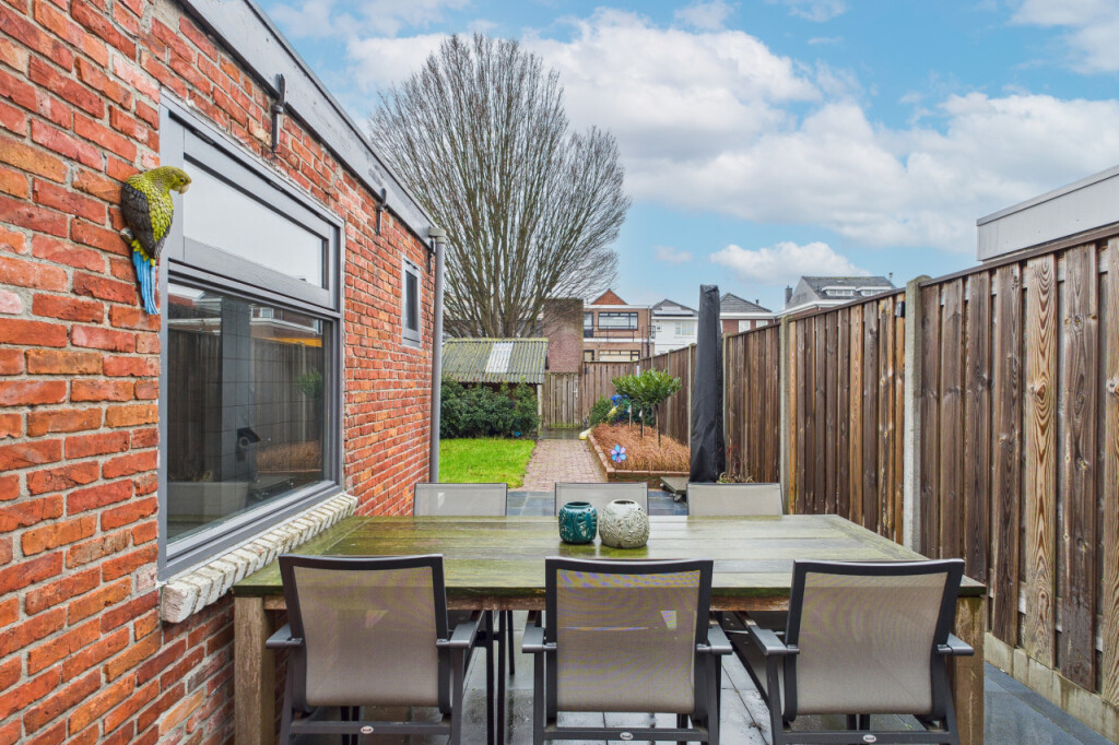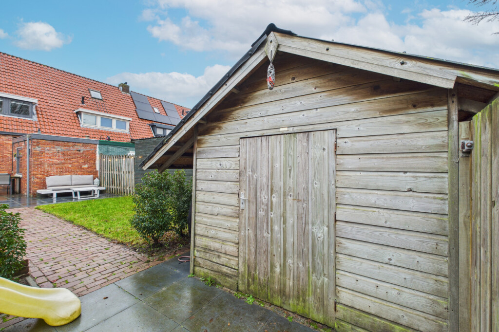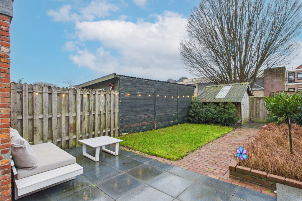 De diepe achtertuin is een absoluut pluspunt van deze woning. De tuin ligt op het zuidwesten, waardoor je hier vrijwel de hele dag van de zon kunt genieten. In 2023 is de tuin opnieuw aangelegd met een terras, gazon en fraai aangelegde plantenborders. Achterin de tuin staat een praktische houten berging en dankzij de eigen achterom is de tuin ook goed bereikbaar.