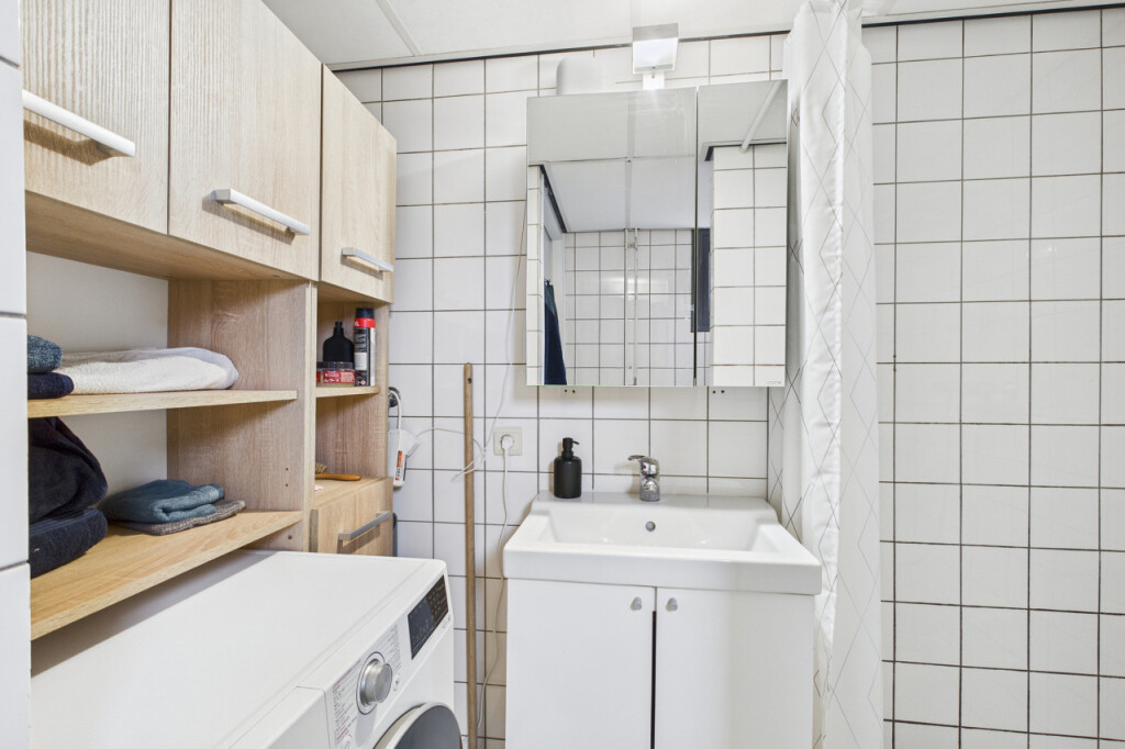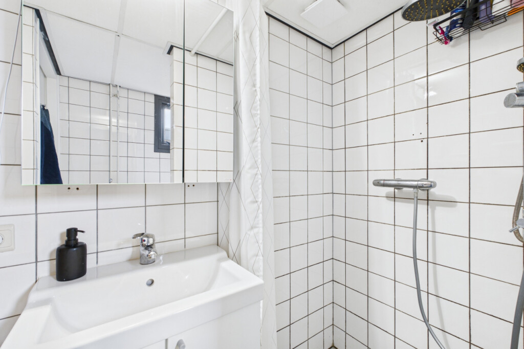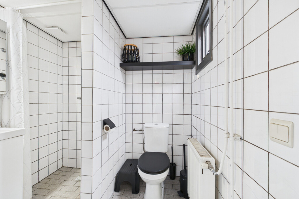 Achter de keuken ligt de aanbouw, waar je via een portaal toegang hebt tot de badkamer. Deze is ingericht met een douche, wastafel met meubel en een toilet. Ook zijn hier de aansluitingen voor de witgoedapparatuur aanwezig. Vanuit het portaal is er bovendien directe toegang tot de achtertuin.