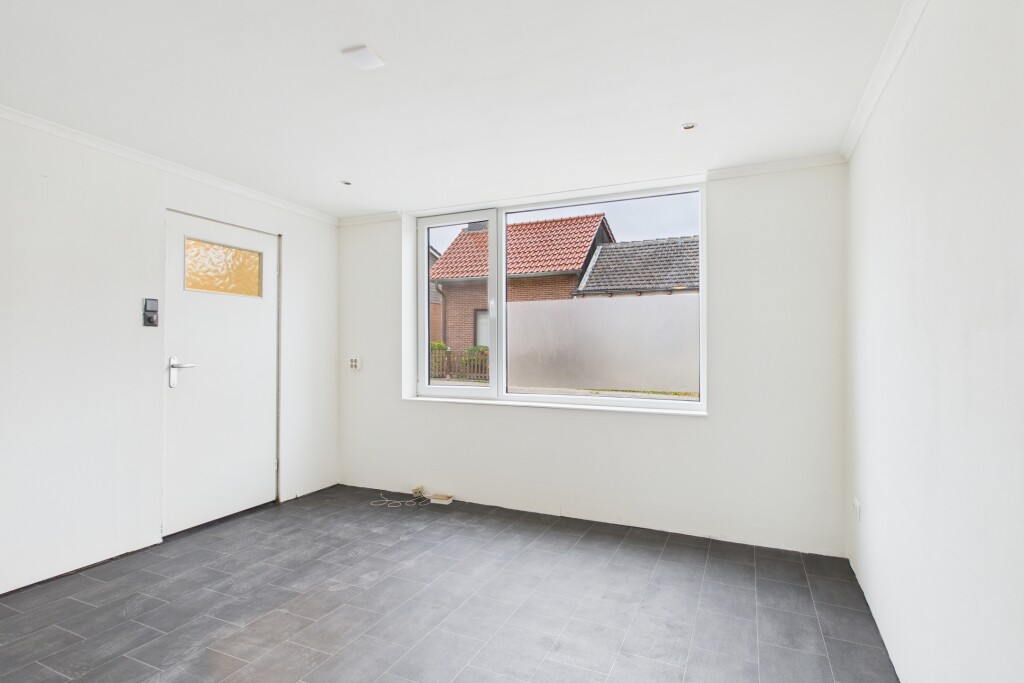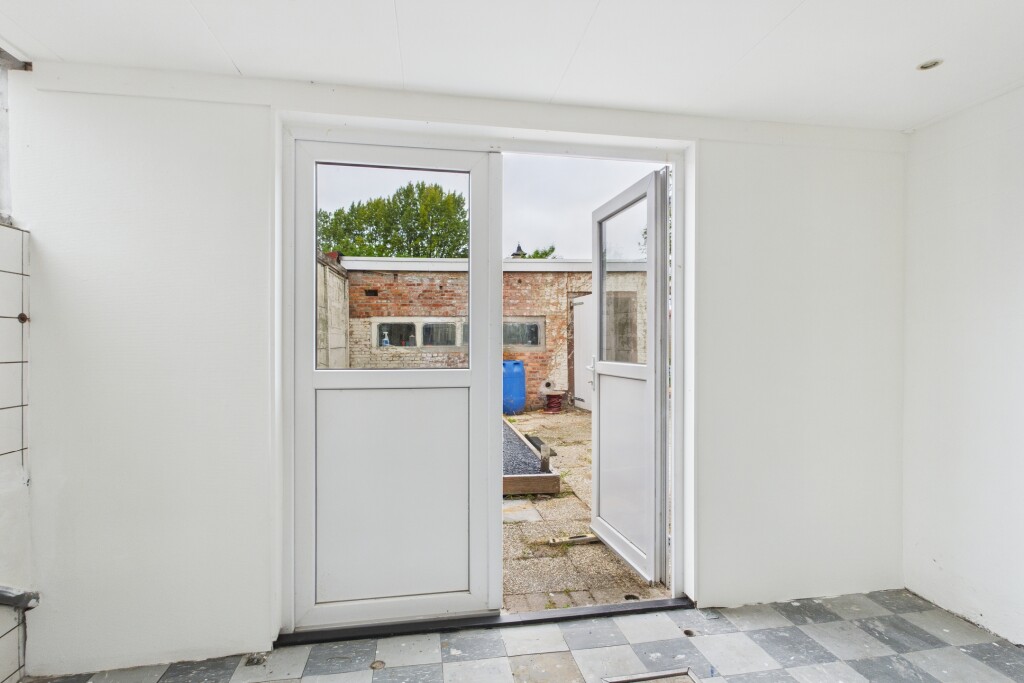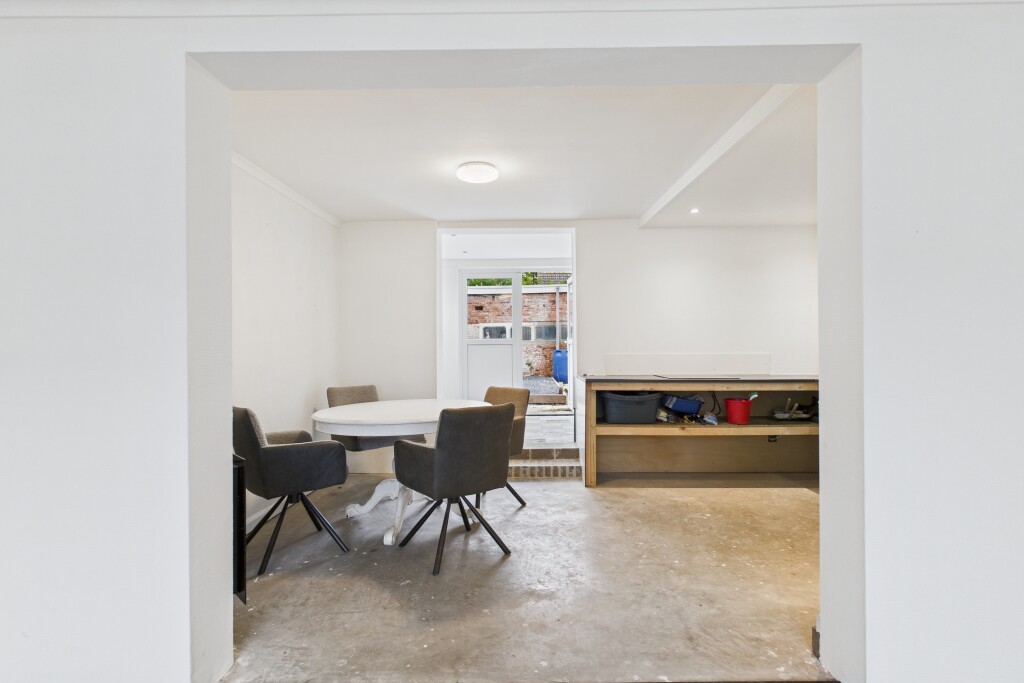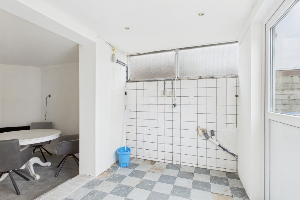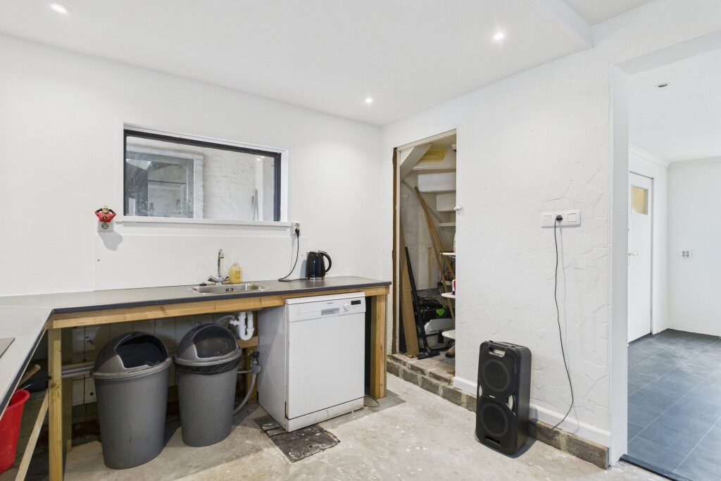 Via de hal met trapopgang bereik je de woonkamer van circa 15 m². Deze staat in open verbinding met de woonkeuken, waar nu een eenvoudig hoekblok met inductieplaat en spoelbak staat. De ruimte biedt volop mogelijkheden voor het plaatsen van een moderne inbouwkeuken. Onder de trap bevindt zich een handige provisieruimte. In de aanbouw zijn de bijkeuken met openslaande tuindeuren en de toiletruimte met cv-ketel gesitueerd.