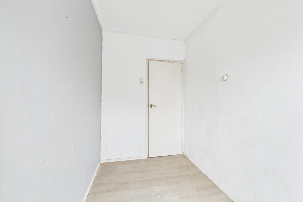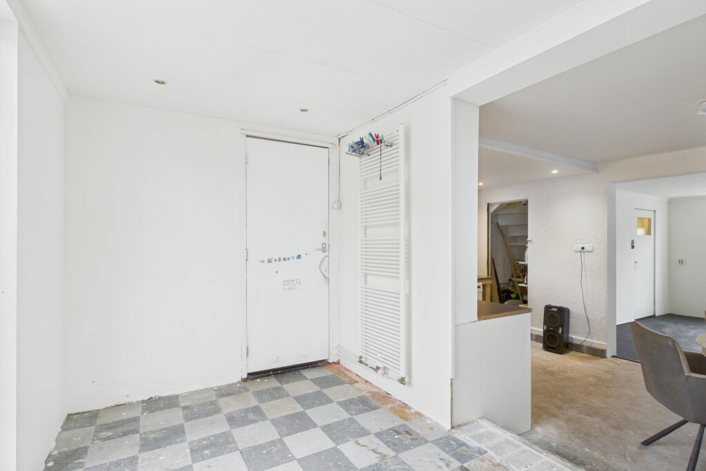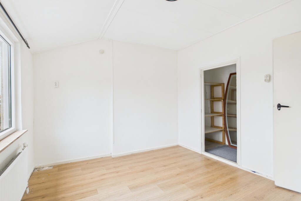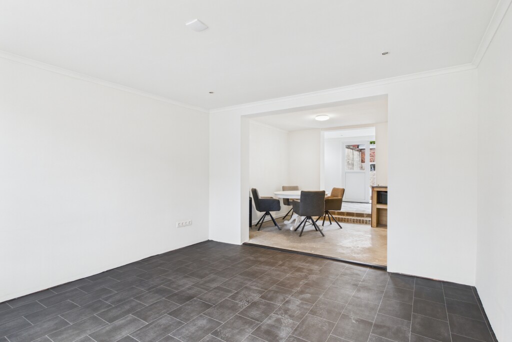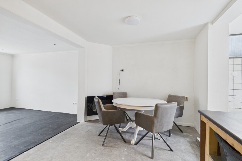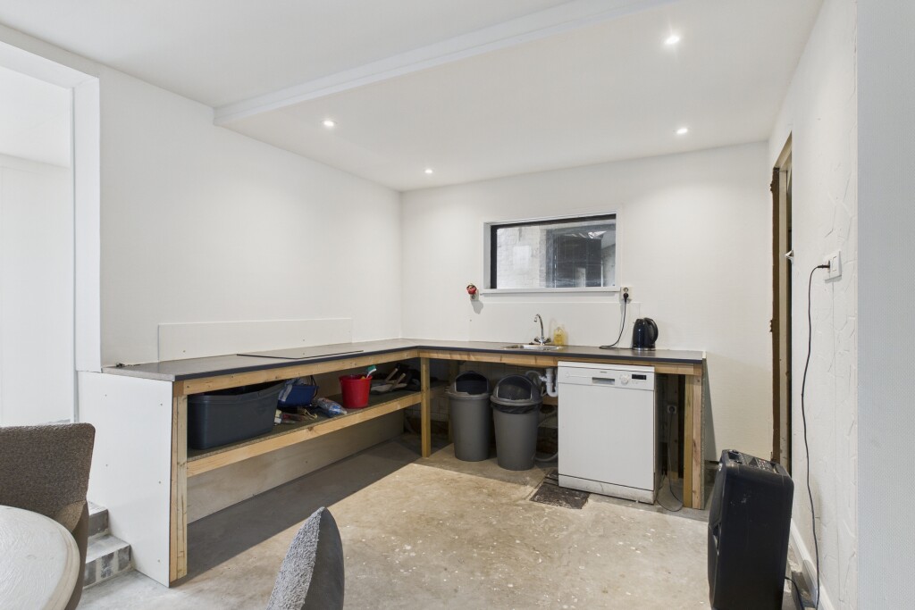 Via de hal met trapopgang bereik je de woonkamer van circa 15 m². Deze staat in open verbinding met de woonkeuken, waar nu een eenvoudig hoekblok met inductieplaat en spoelbak staat. De ruimte biedt volop mogelijkheden voor het plaatsen van een moderne inbouwkeuken. Onder de trap bevindt zich een handige provisieruimte. In de aanbouw zijn de bijkeuken met openslaande tuindeuren en de toiletruimte met cv-ketel gesitueerd.