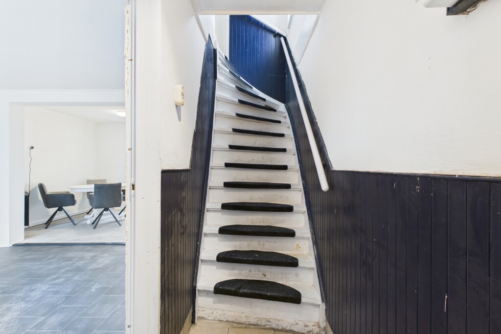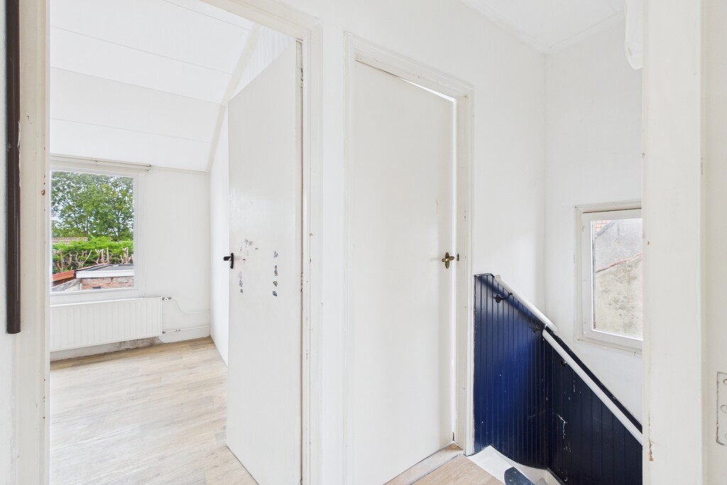 Overloop met toegang tot drie slaapkamers. De grootste kamer aan de voorzijde beschikt over een open kastruimte en een deur naar de badkamer met toilet en douche.
